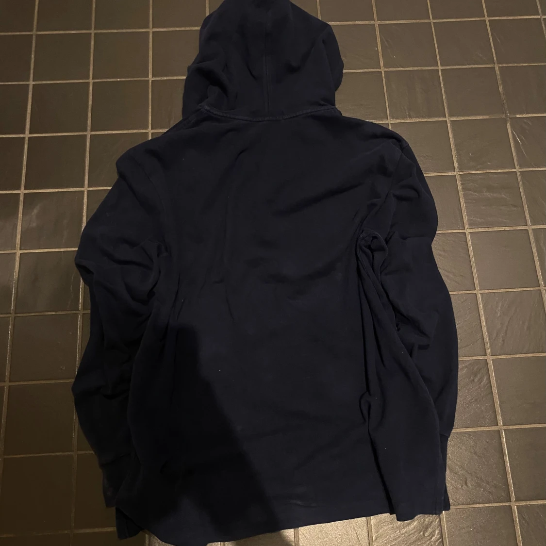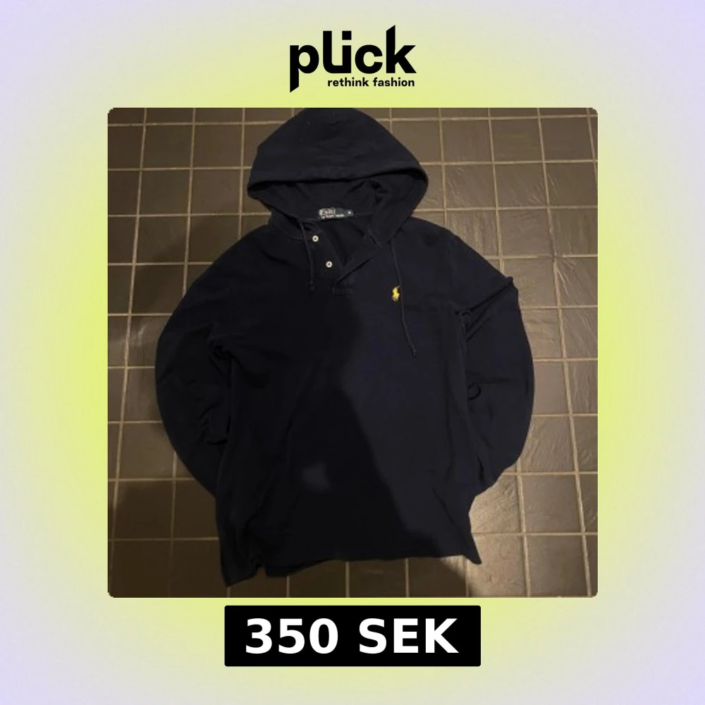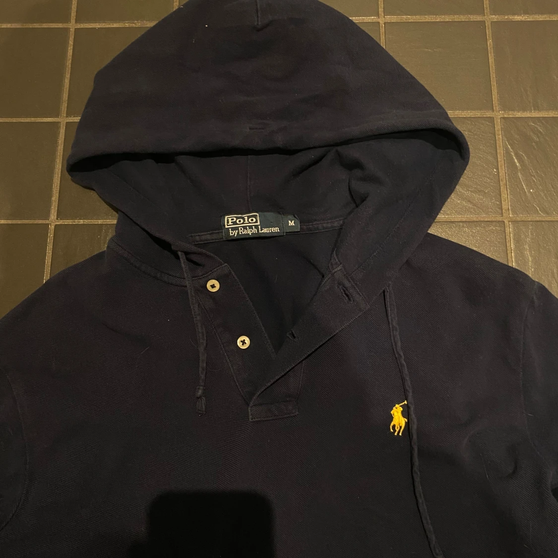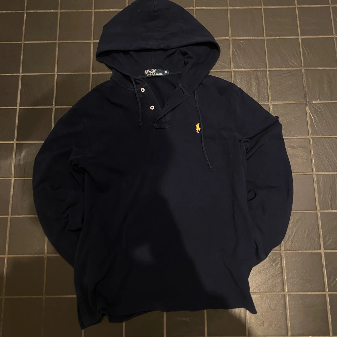 Snygg mörkblå hoodie från Polo Ralph Lauren med klassisk gul logga på bröstet. Tröjan har huva med snörning, knappar vid halsen och är tillverkad i mjuk bomull. Perfekt för dig som gillar stilrena och bekväma plagg.