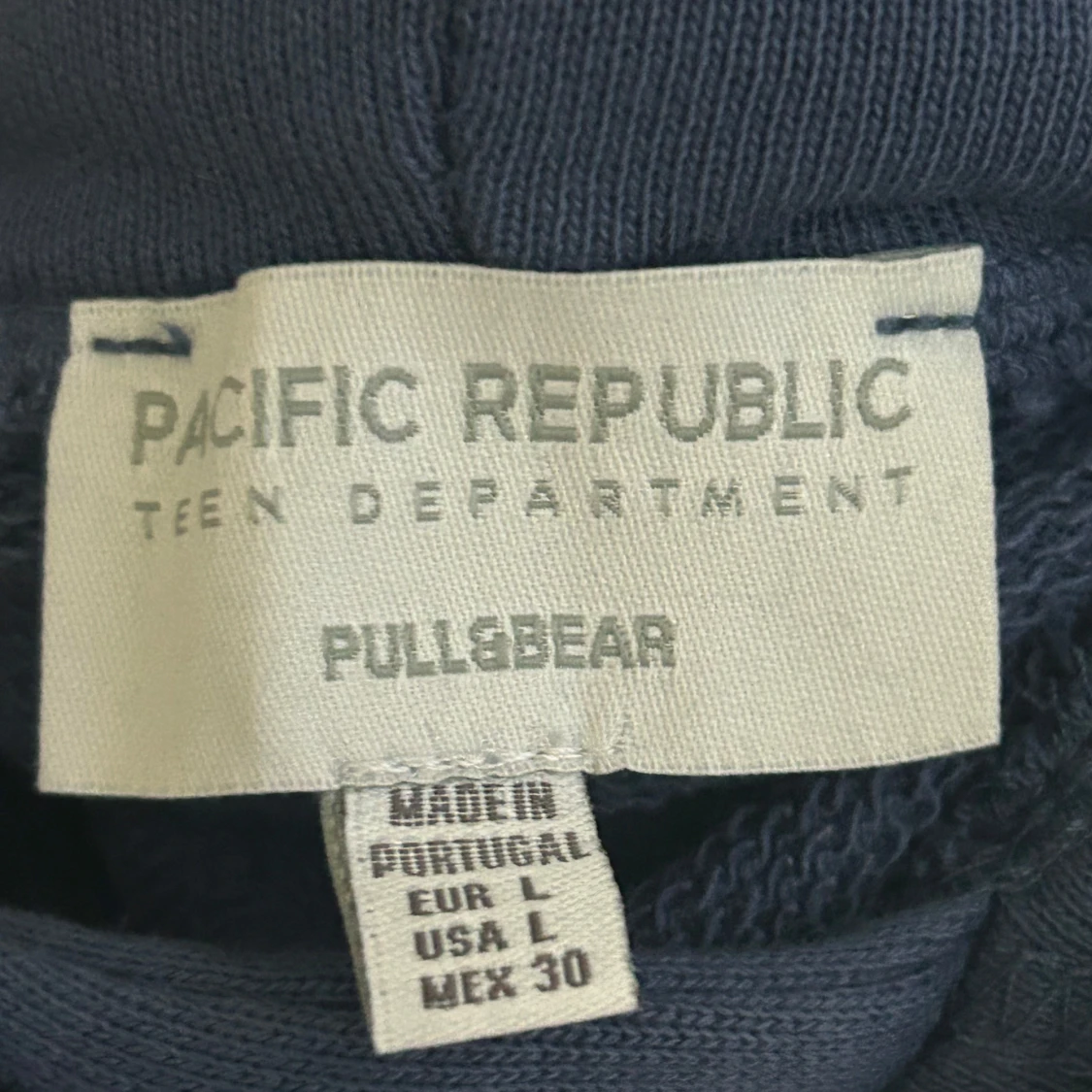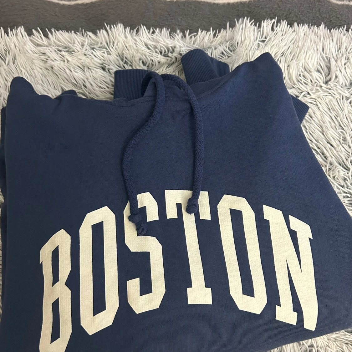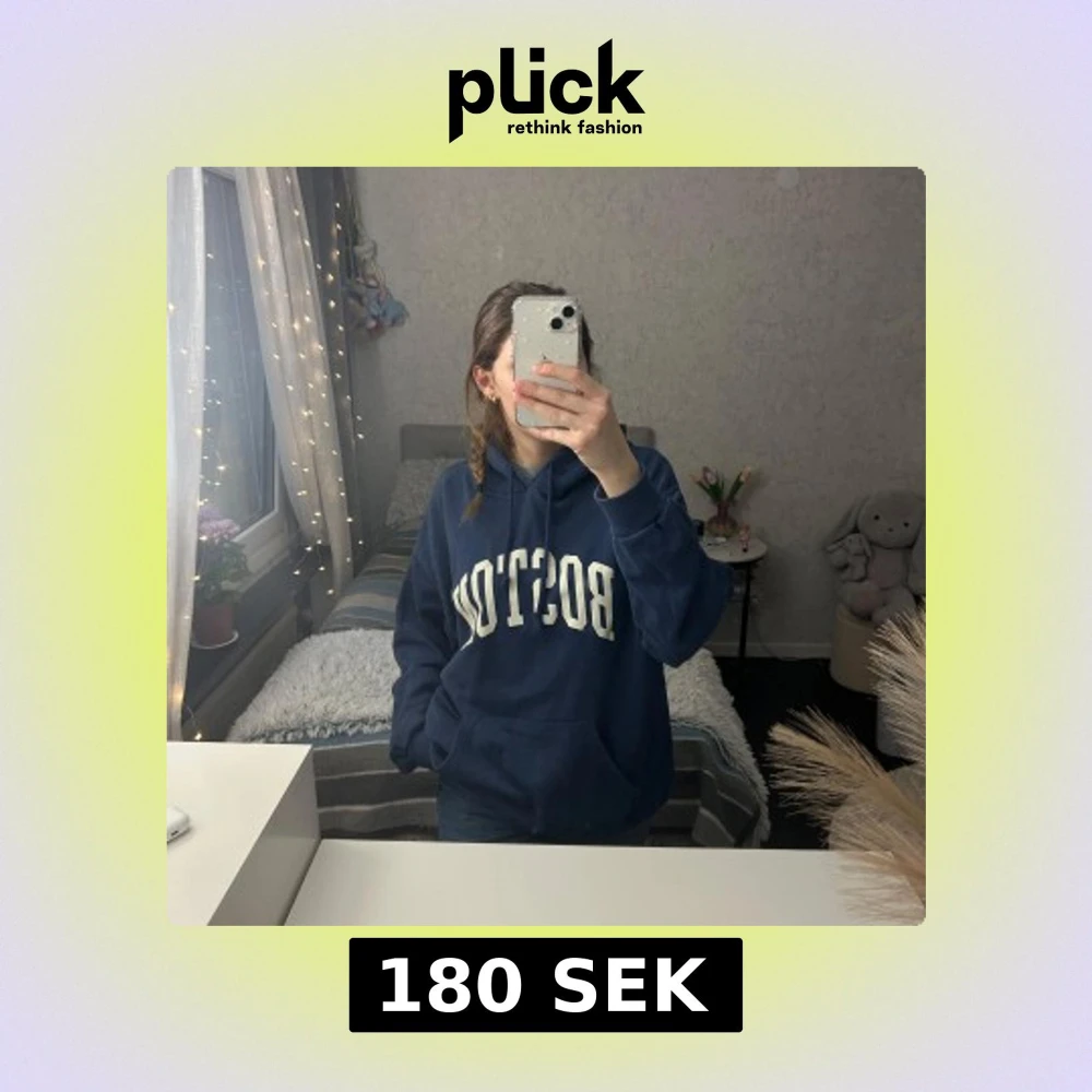 Säljer en snygg mörkblå hoodie från Pull&Bear med texten 'BOSTON' i vitt på framsidan. Köptes för 379kr, mitt pris är 180kr
