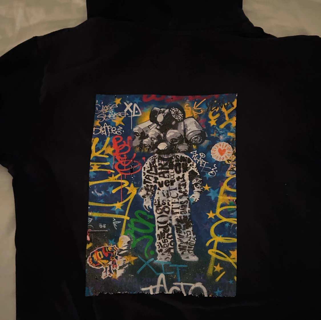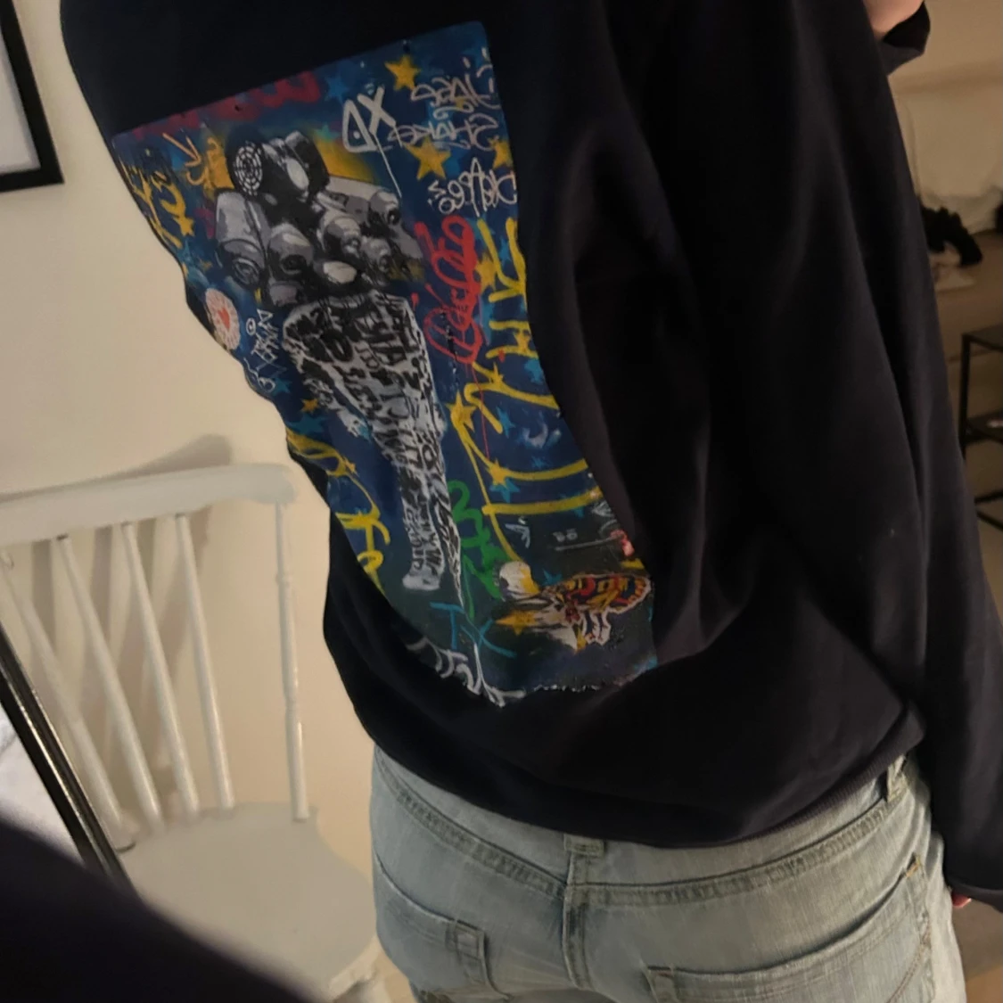 Säljer en mörkblå cool hoodie med ett graffiti-tryck på ryggen från thecoolelephant. Den har en stor ficka fram och justerbar huva med snören. Nypris 600 💗
