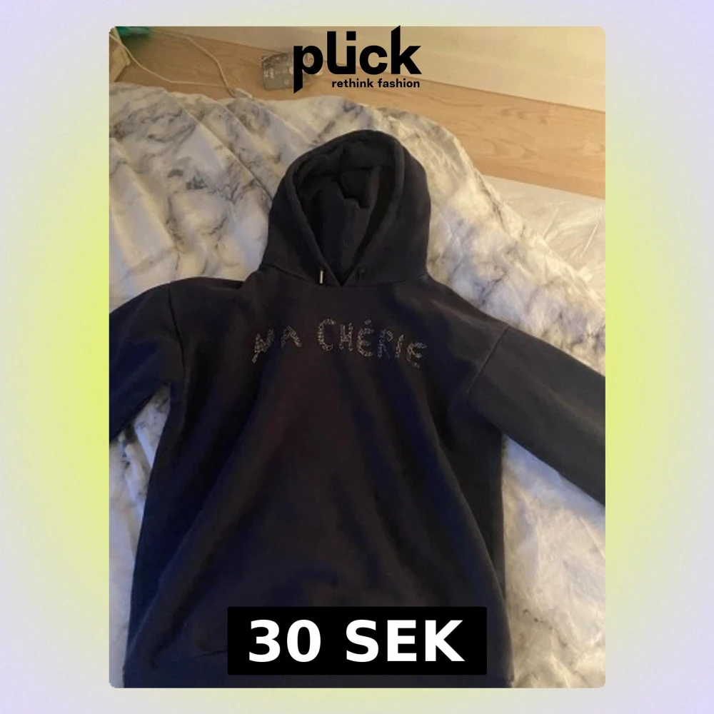 Snygg mörkblå hoodie med texten 'Ma Chérie' i strass. Det saknas en metal bit på ena snöret. Annars är den jätte fin.💌❤️