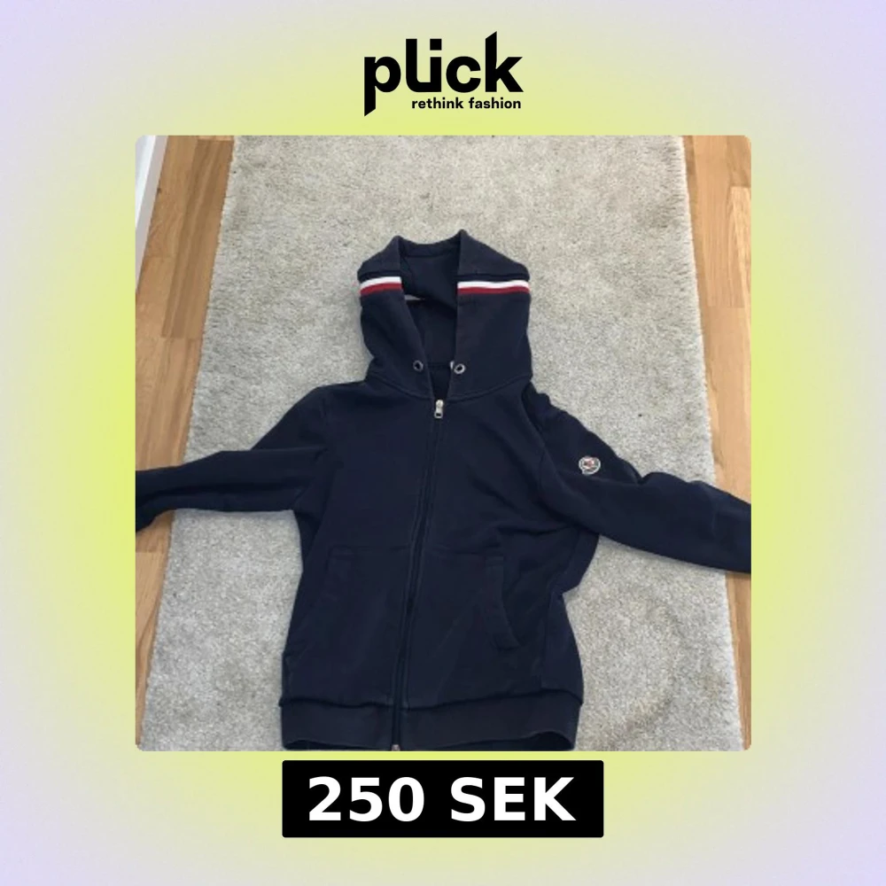 Säljer en mörkblå hoodiejacka från Moncler med dragkedja och huva. hoodie har vita och röda ränder på huvan samt Moncler-logga på ärmen. Praktiska fickor framtill och ribbade muddar. Perfekt för dig som gillar stilren design och streetwear. det har en hål i vänstra sidan