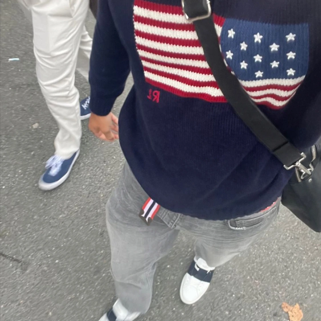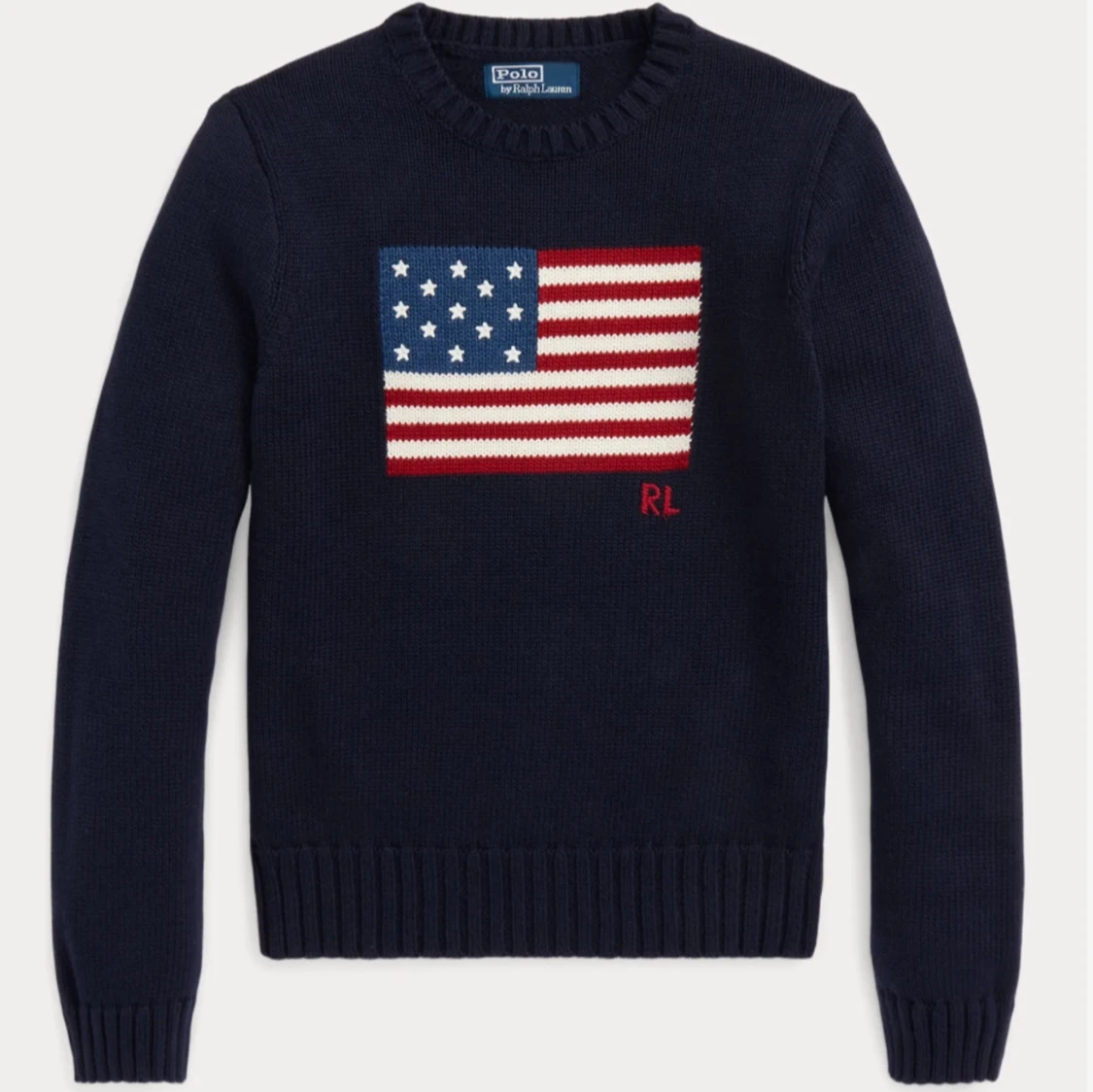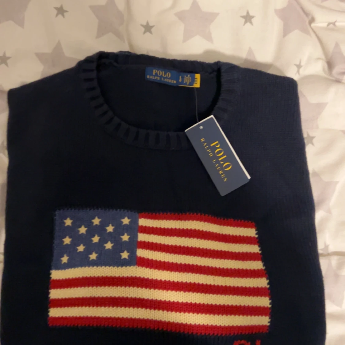 Säljer en mörkblå stickad tröja från Polo Ralph Lauren med en stor amerikansk flagga på framsidan. Tröjan har långa ärmar och ribbstickade muddar vid ärmslut och nederkant. Perfekt för en stilren och avslappnad look.