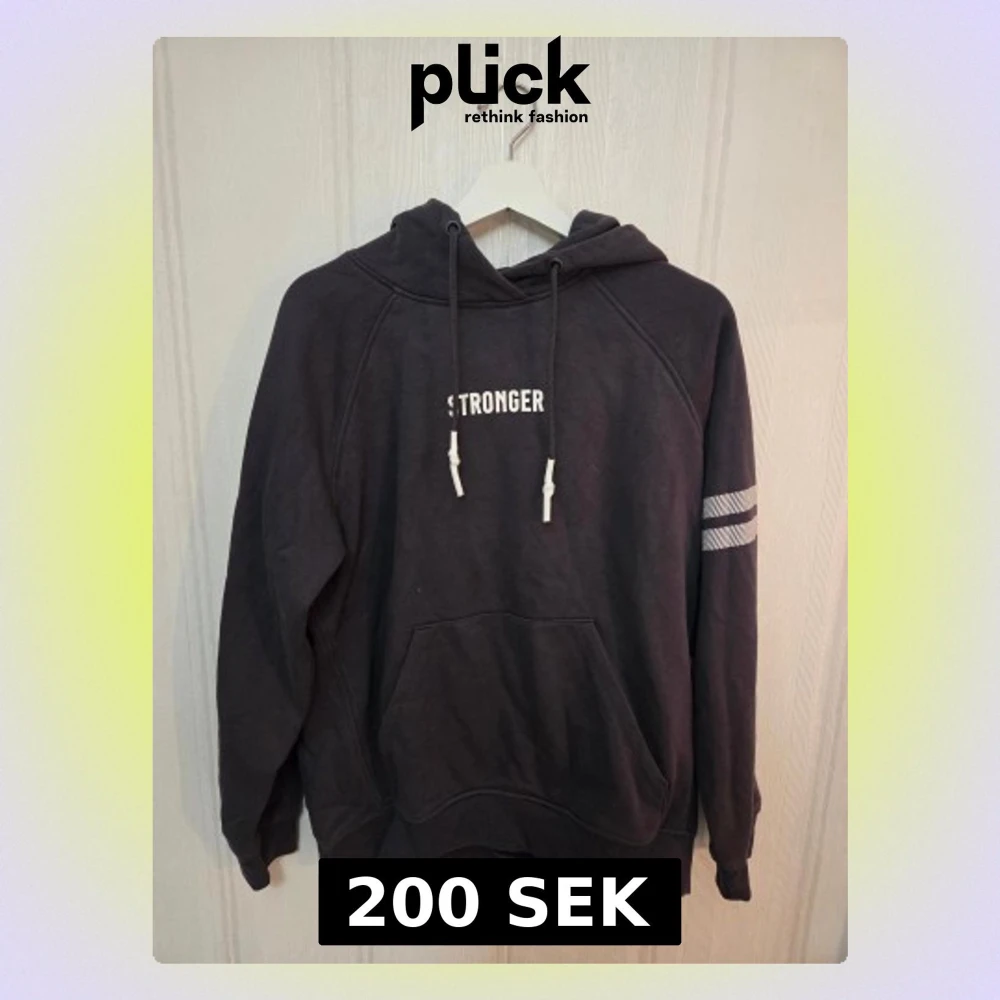 Mörkgrå hoodie från Stronger med vit text på bröstet och två vita ränder på ena ärmen. Nypris är ca 700 säljes för 200. Djur finns i hemmet så lite katthår kan förekomma