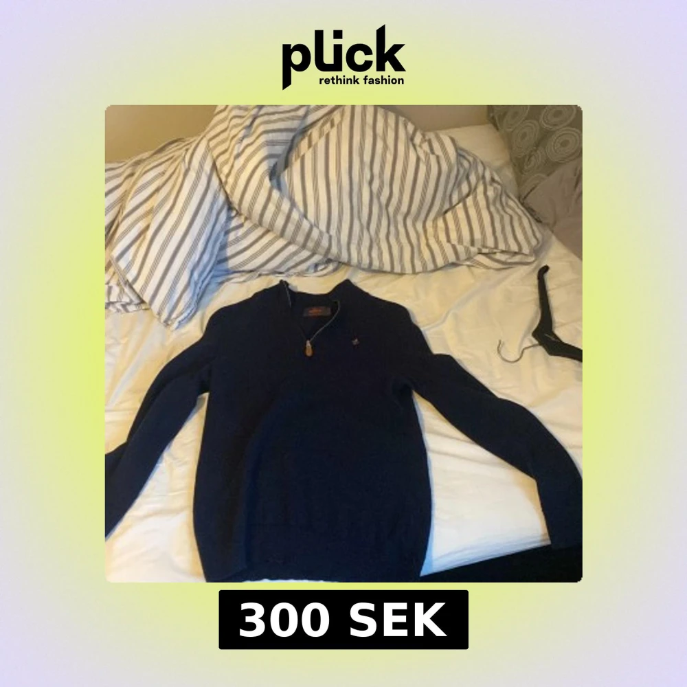 Säljer en stilren mörkblå tröja med dragkedja vid halsen. Perfekt för kyligare dagar och passar bra till både jeans och chinos. Tröjan har långa ärmar och en liten logga på bröstet.