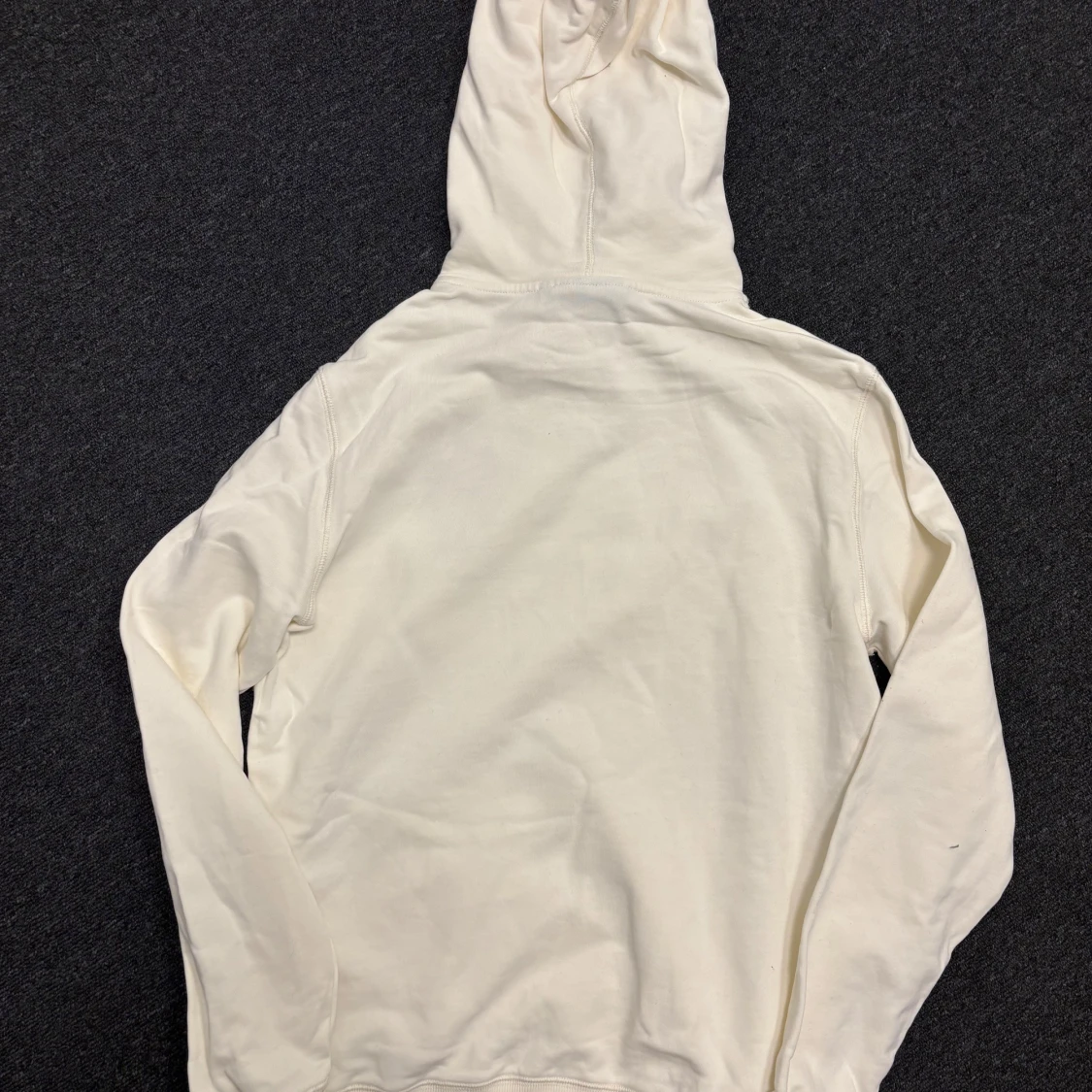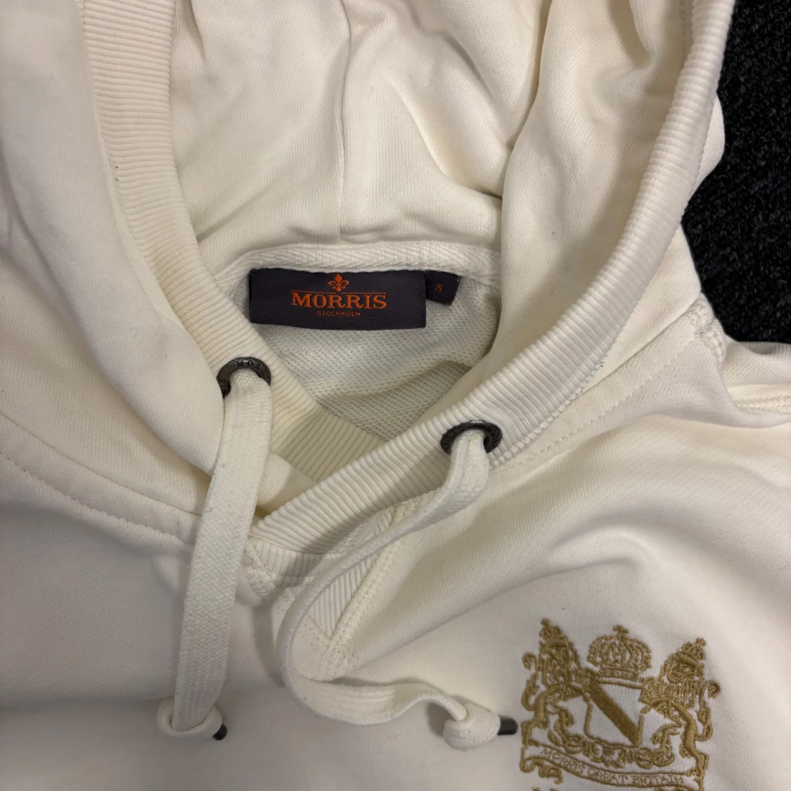 Säljer en stilren vit hoodie från Morris med broderad logotyp och brittisk flagga på bröstet. Tröjan har en justerbar huva med snörning och en praktisk magficka. Perfekt för en avslappnad stil.