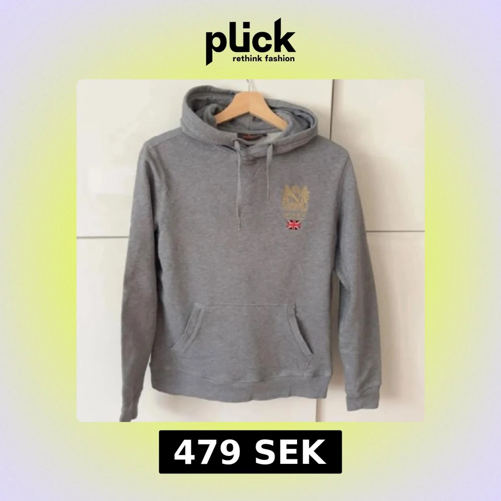 Grå hoodie från Morris London med broderad guldfärgad logga och brittisk flagga på bröstet. Tröjan har huva med snörning och en stor magficka. Perfekt för dig som gillar klassisk och stilren streetwear.