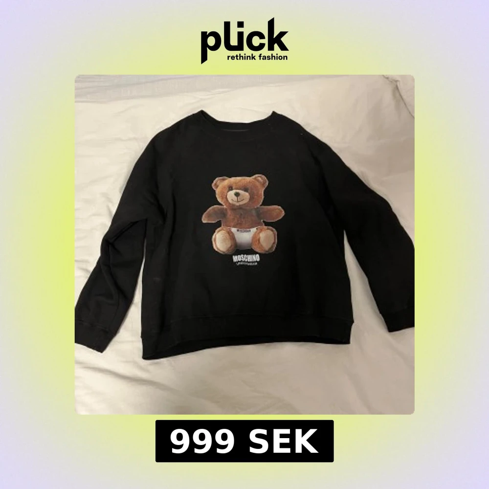 Säljer en svart tröja från Moschino med ett stort nalletryck på framsidan. Tröjan har långa ärmar och är tillverkad i bomull för en bekväm passform. Perfekt för dig som vill ha en stilren men lekfull look.