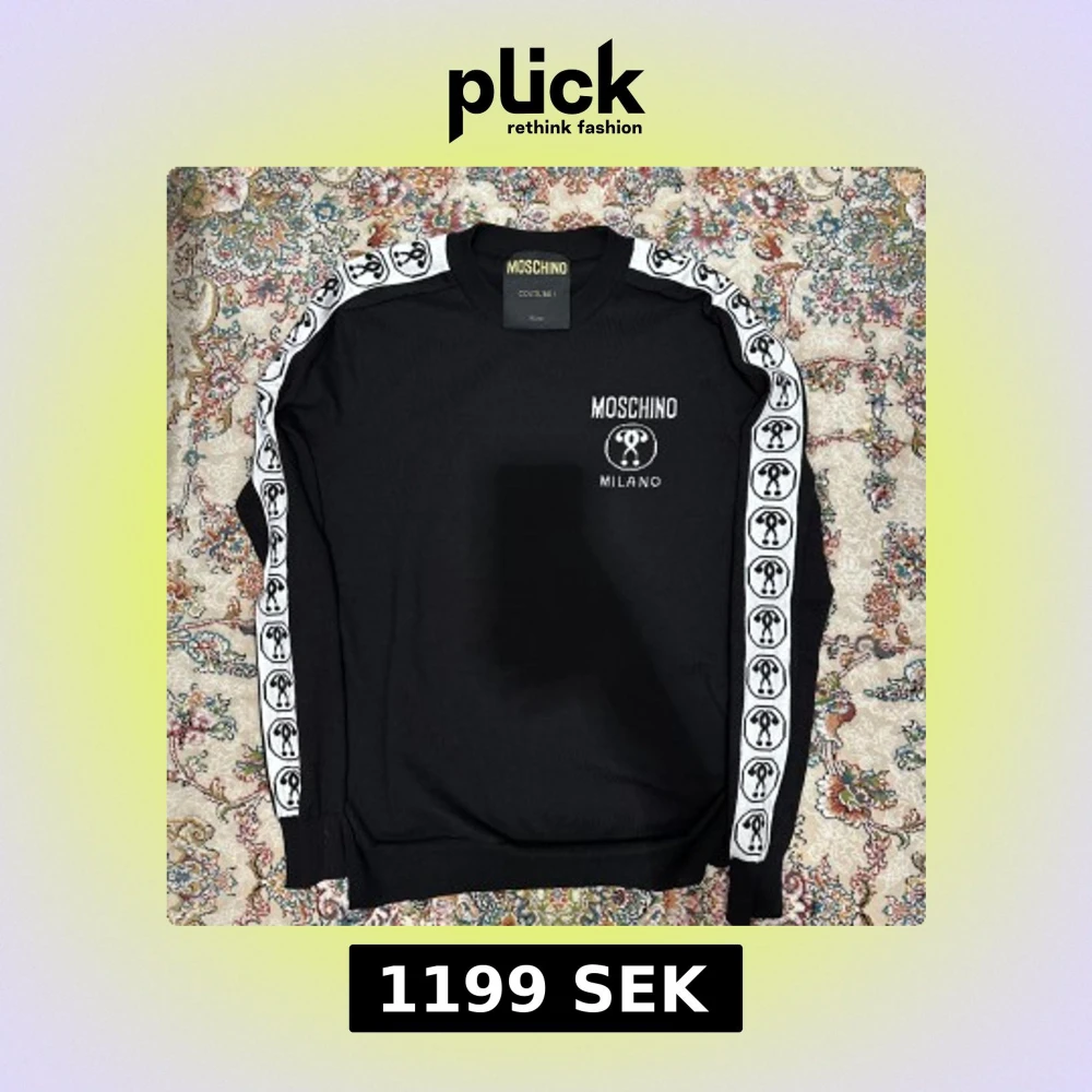 Snygg svart tröja från Moschino med vita detaljer och logotyp på bröstet. Tröjan har långa ärmar med ett mönstrat band längs ärmarna. Perfekt för en stilren look.