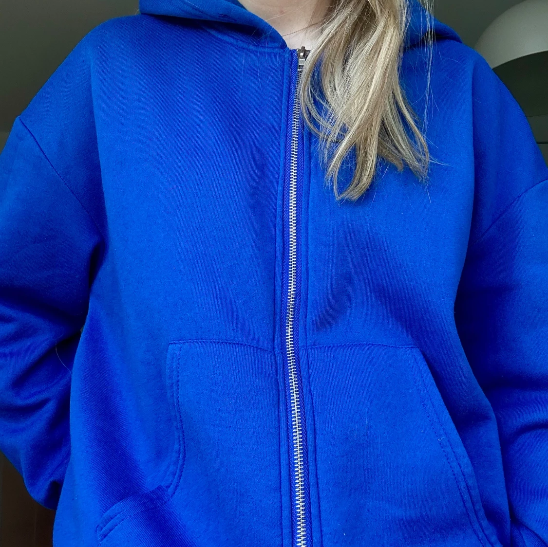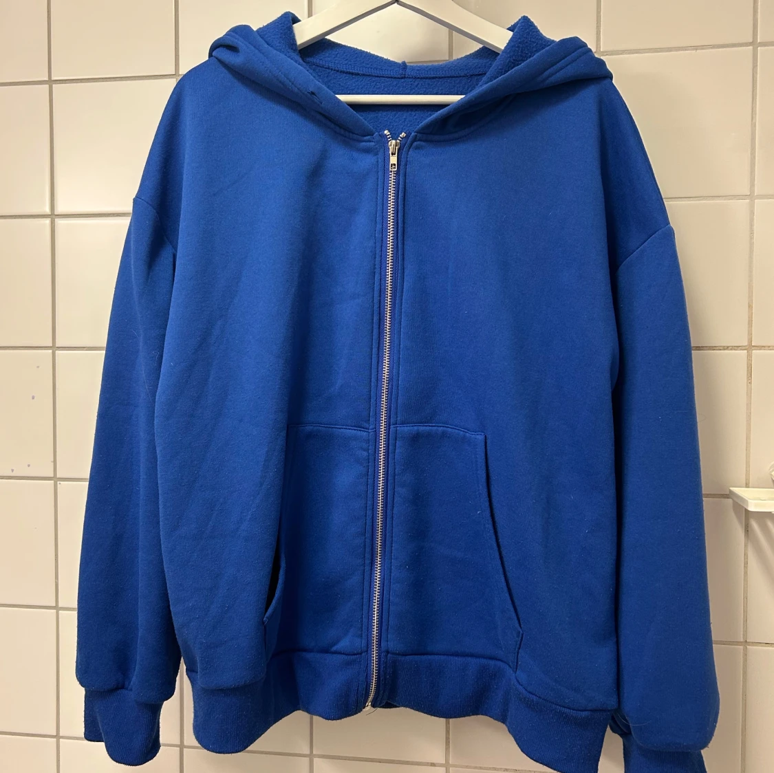 Säljer en snygg blå zip-hoodie med dragkedja framtill, går att stylea hur man vill!