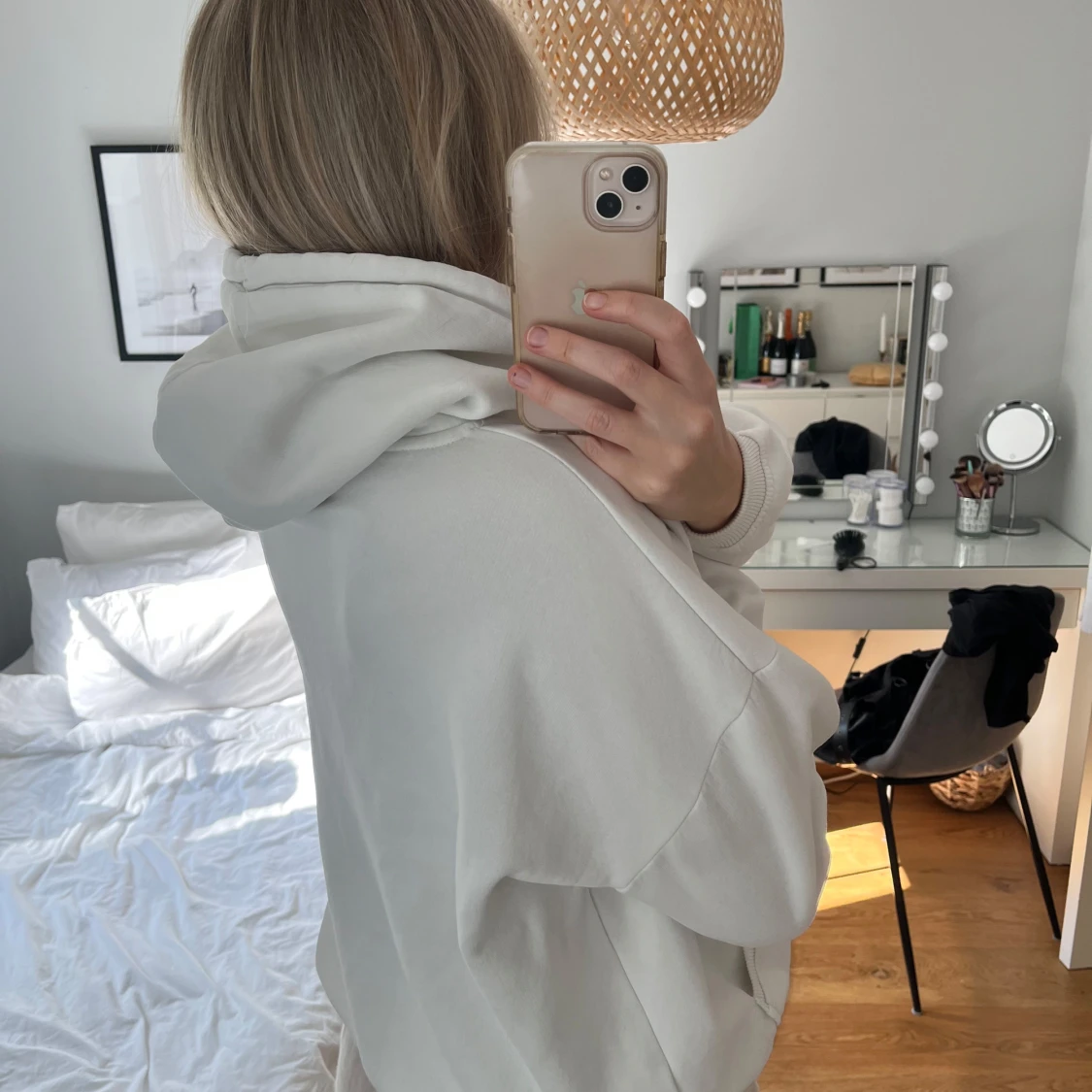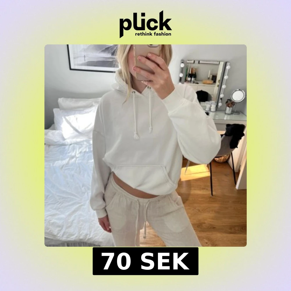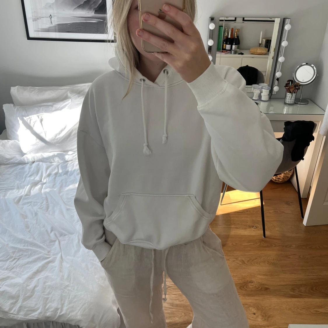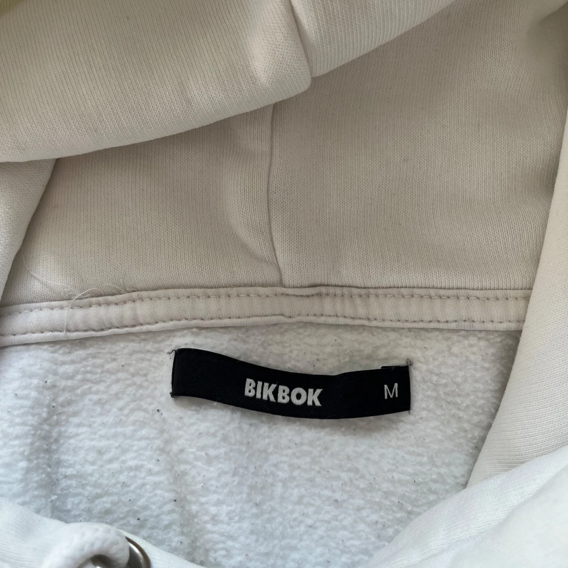 Super snygg vit hoodie från BikBok. Tröjan har en luva med justerbar snörning. Lite urtvättat material på insidan (se sista bilden), annars i mycket bra skick!💕