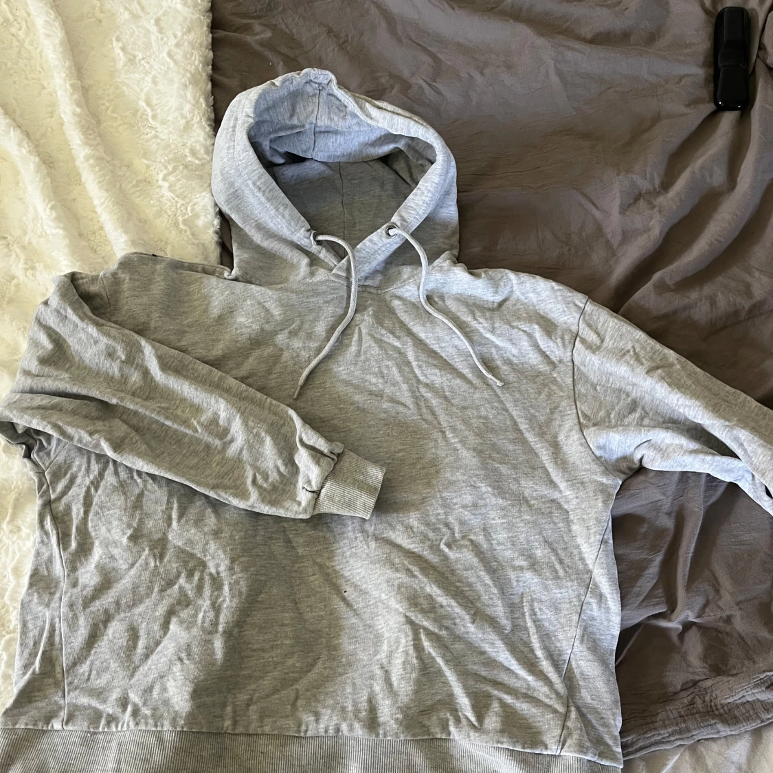 jätte fin grå hoodie! knappt aldrig använd men den är tvättad några gånger så tyget inuti är inte så skönt, känns typ som en handduk. men jätte fin ändå! mer än det så har den inga defekter!