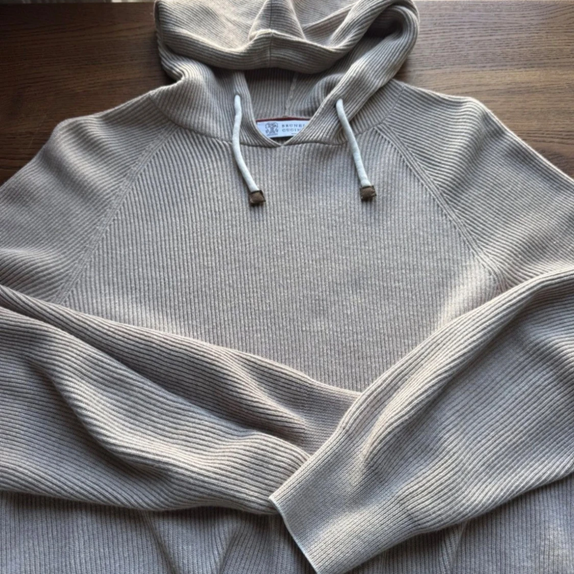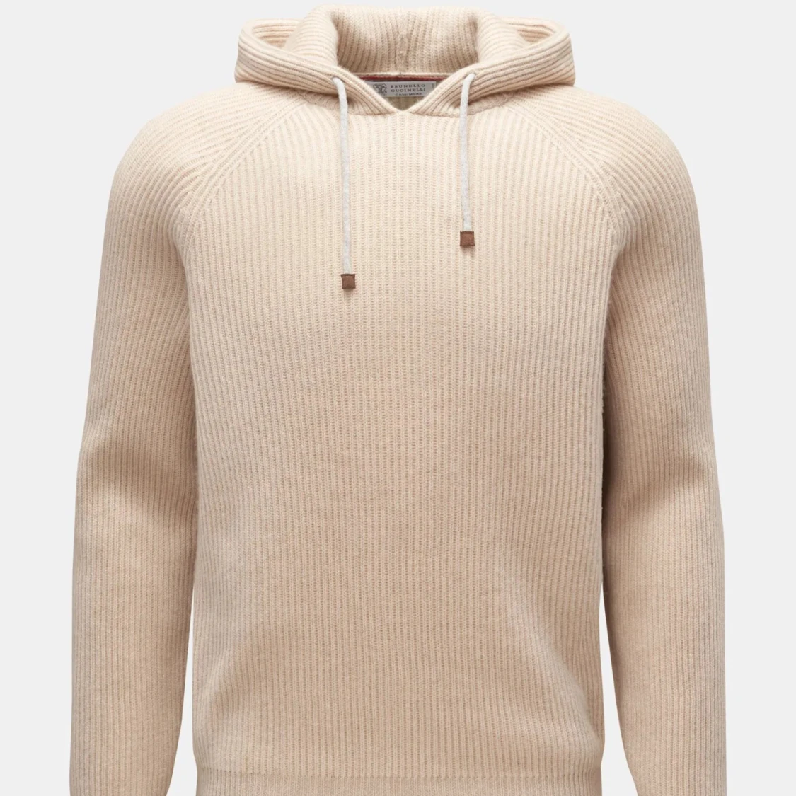 Beige stickad hoodie från Brunello Cucinelli. Nypris ligger runt 14 000kr.
