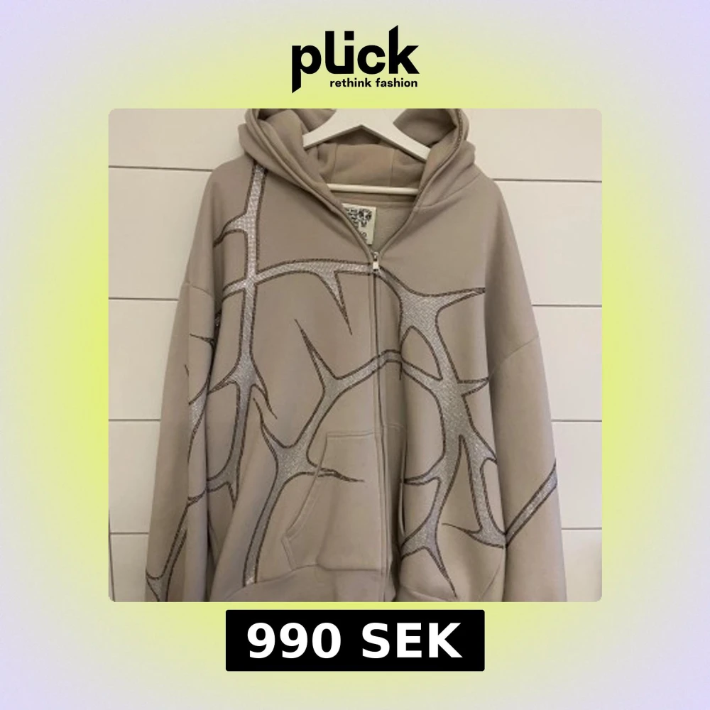 En ljusbeige unisex hoodie med rhinestones från Named Collective! Dragkedjan funkar fint och kan öppnas/stängas både uppifrån och nerifrån. Den går även hela vägen till toppen av luvan. Storlek X/XL. Tyget är otroligt mjukt på insidan. Nästan som ny förutom att det tyvärr finns några fläckar på fickan. (Sista bilden) Hör gärna av dig om du har frågor!!