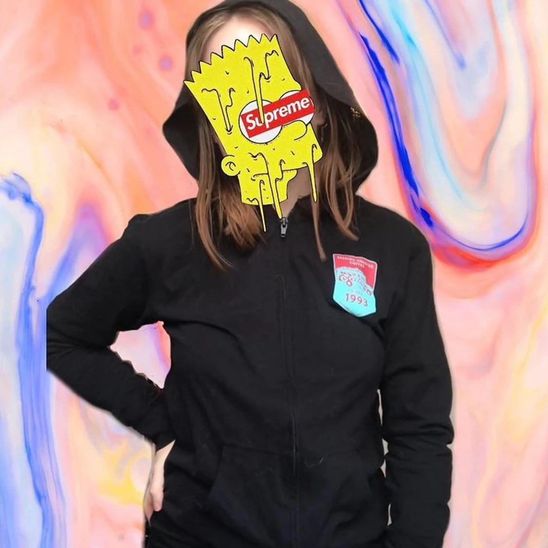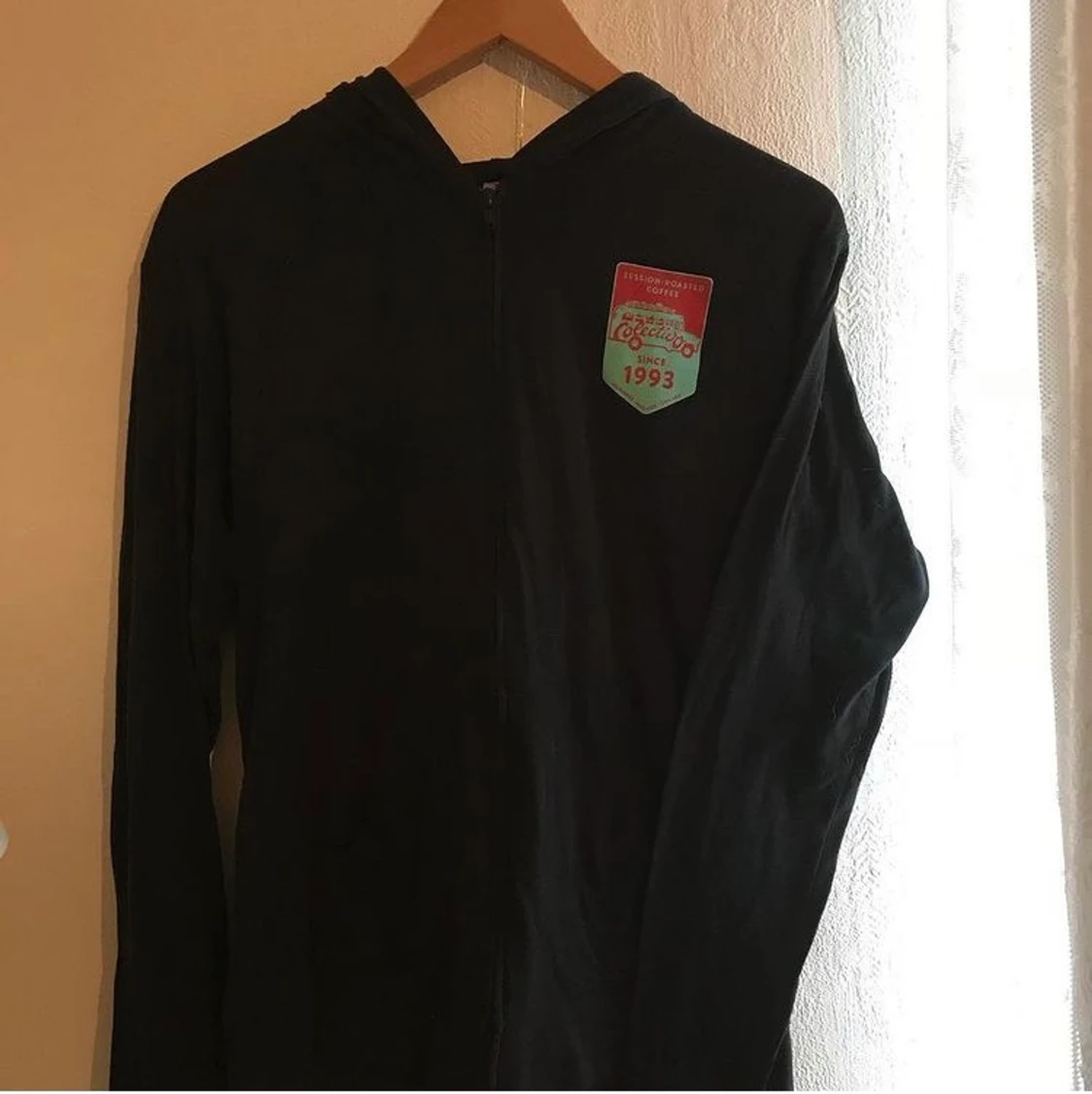 Black stretchy zip hoodie with surf/coffee logo on chest.