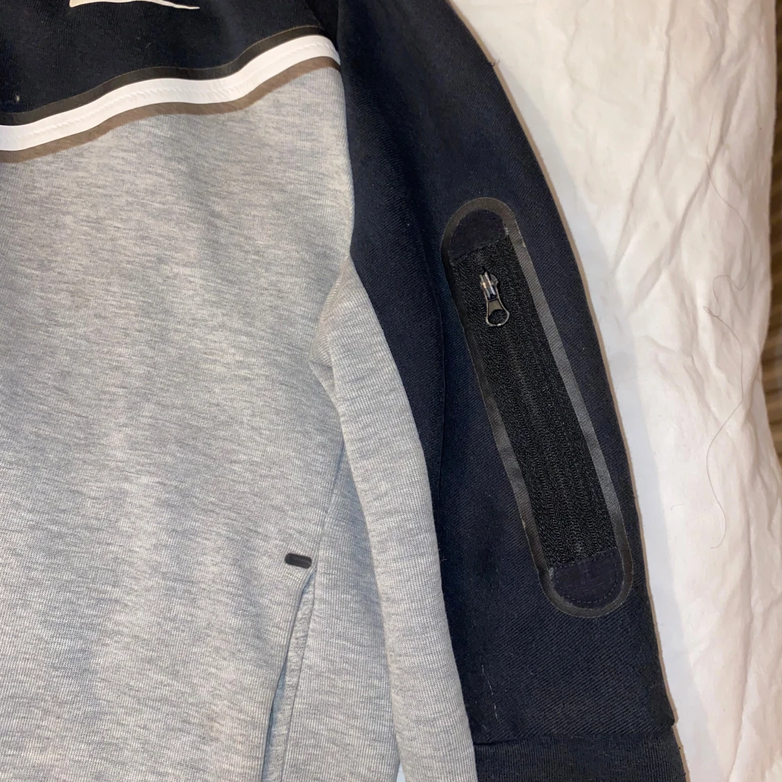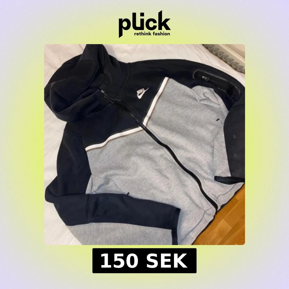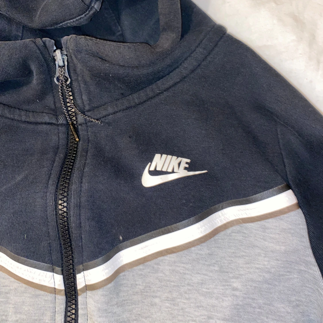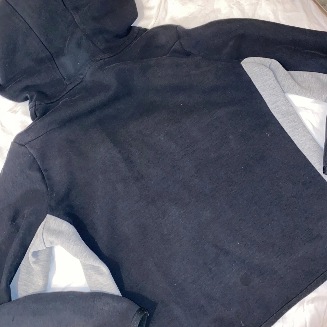Nike hoodie med huva i svart och ljusgrått, med vit logga på bröstet och snygga kontrastlinjer.