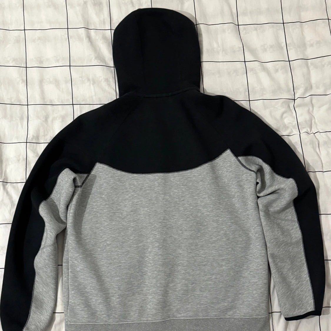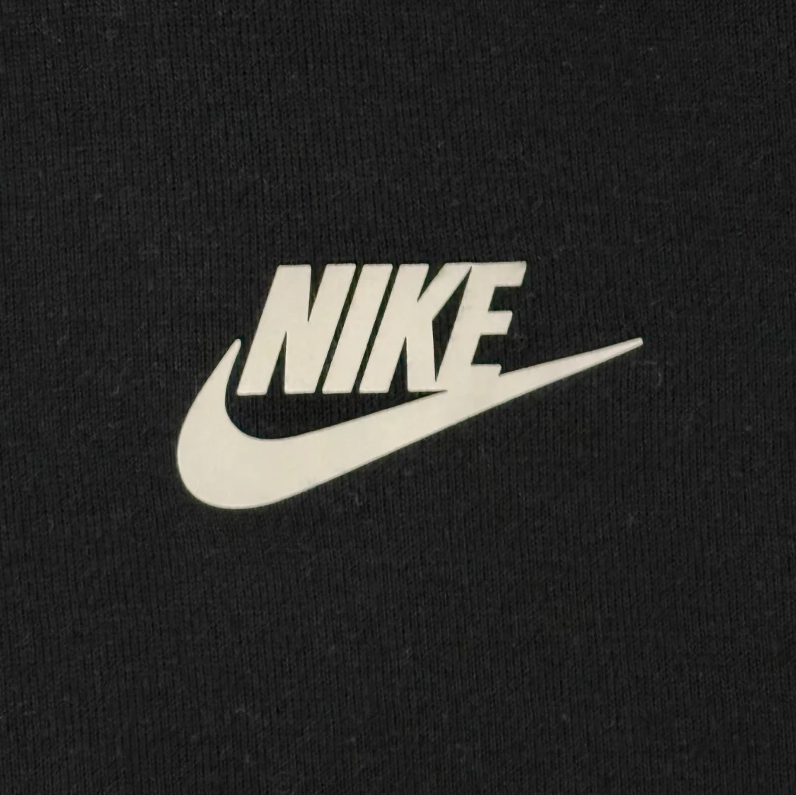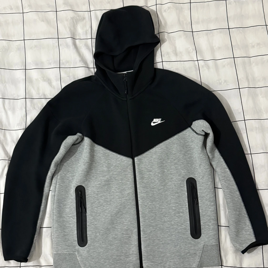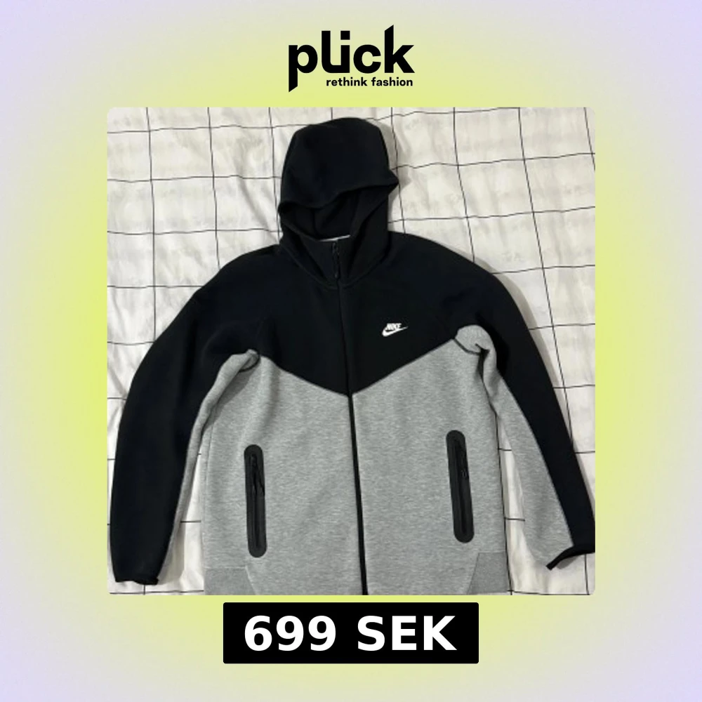 Nike hoodiejacka i svart och grått med dragkedja framtill och två fickor med dragkedja. Jackan har huva och är långärmad, med Nike-logga på bröstet. Materialet är en mix av bomull och polyester, vilket gör den mjuk och bekväm. Perfekt för chill och streetwear.