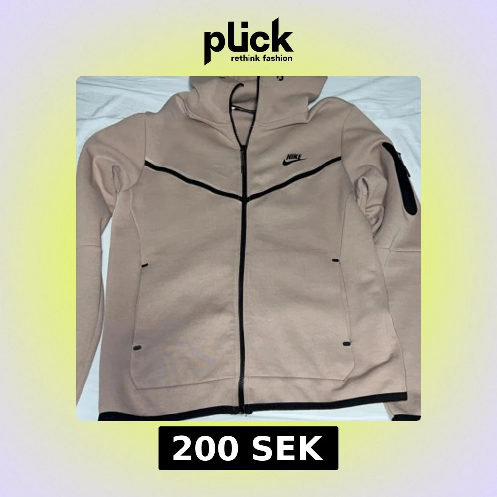 Säljer en snygg beige hoodie från Nike med dragkedja och huva. Den har svarta detaljer och en ficka på ärmen. Perfekt för en avslappnad stil.