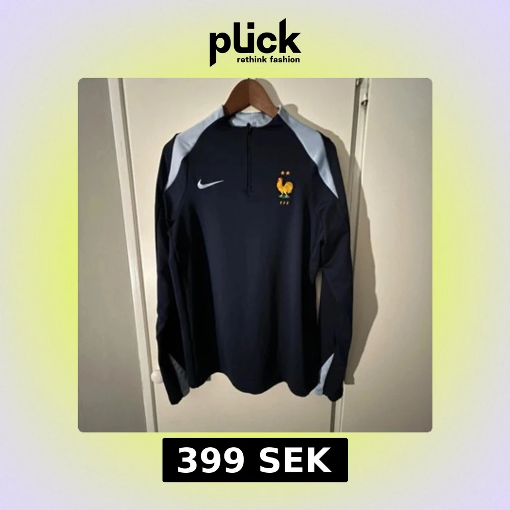 Mörkblå långärmad fotbollströja från Nike med Frankrikes landslagsemblem på bröstet och ljusblå detaljer vid axlar och ärmslut. Tröjan är i Dri-Fit-material och har en halv dragkedja framtill. Slim fit-modell, perfekt för träning eller match.