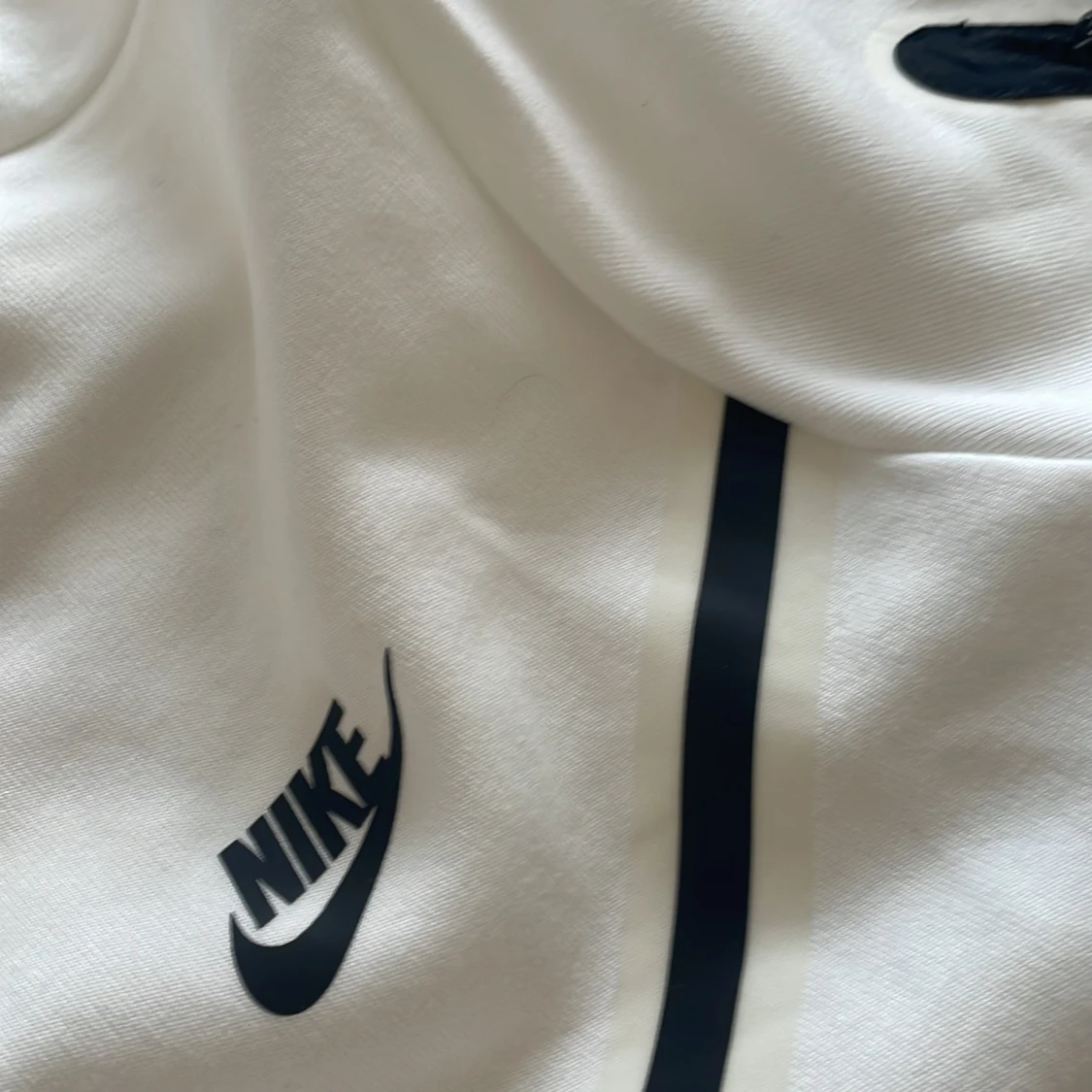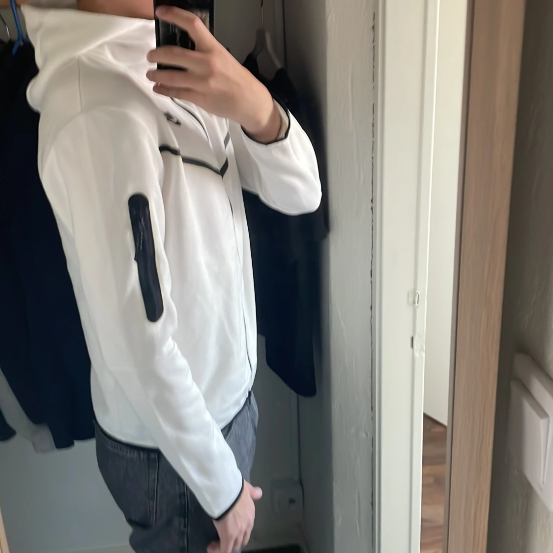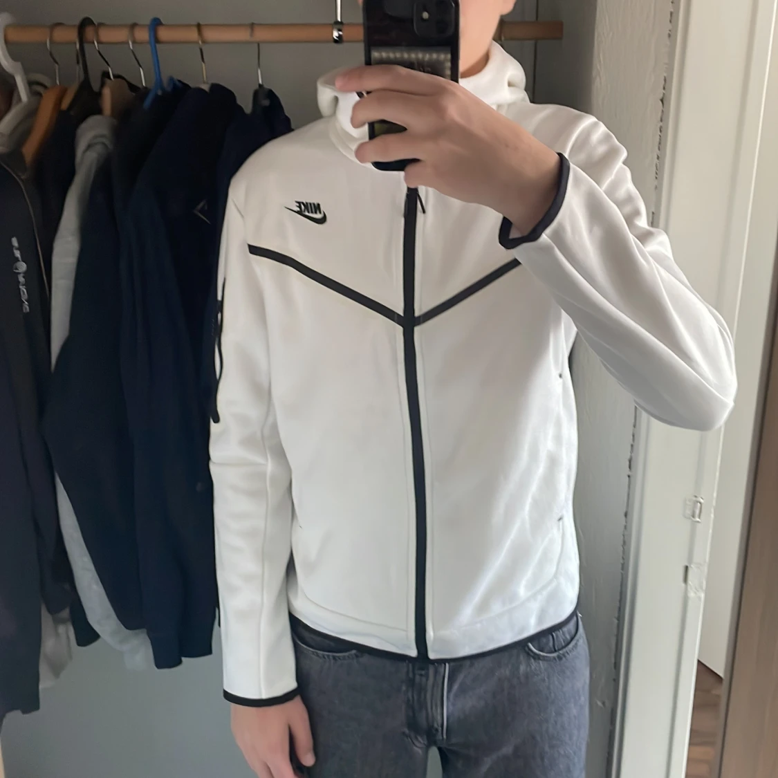 Snygg vit hoodie från Nike med svarta detaljer och dragkedja hela vägen. Hoodien har huva, lång ärm och en cool ficka med dragkedja på ena armen. Perfekt för dig som gillar sportig stil och vill ha något som sticker ut. Jag är 185 cm lång och den passar mig perfekt lite kort bara. Har bara använt den max 5 gånger