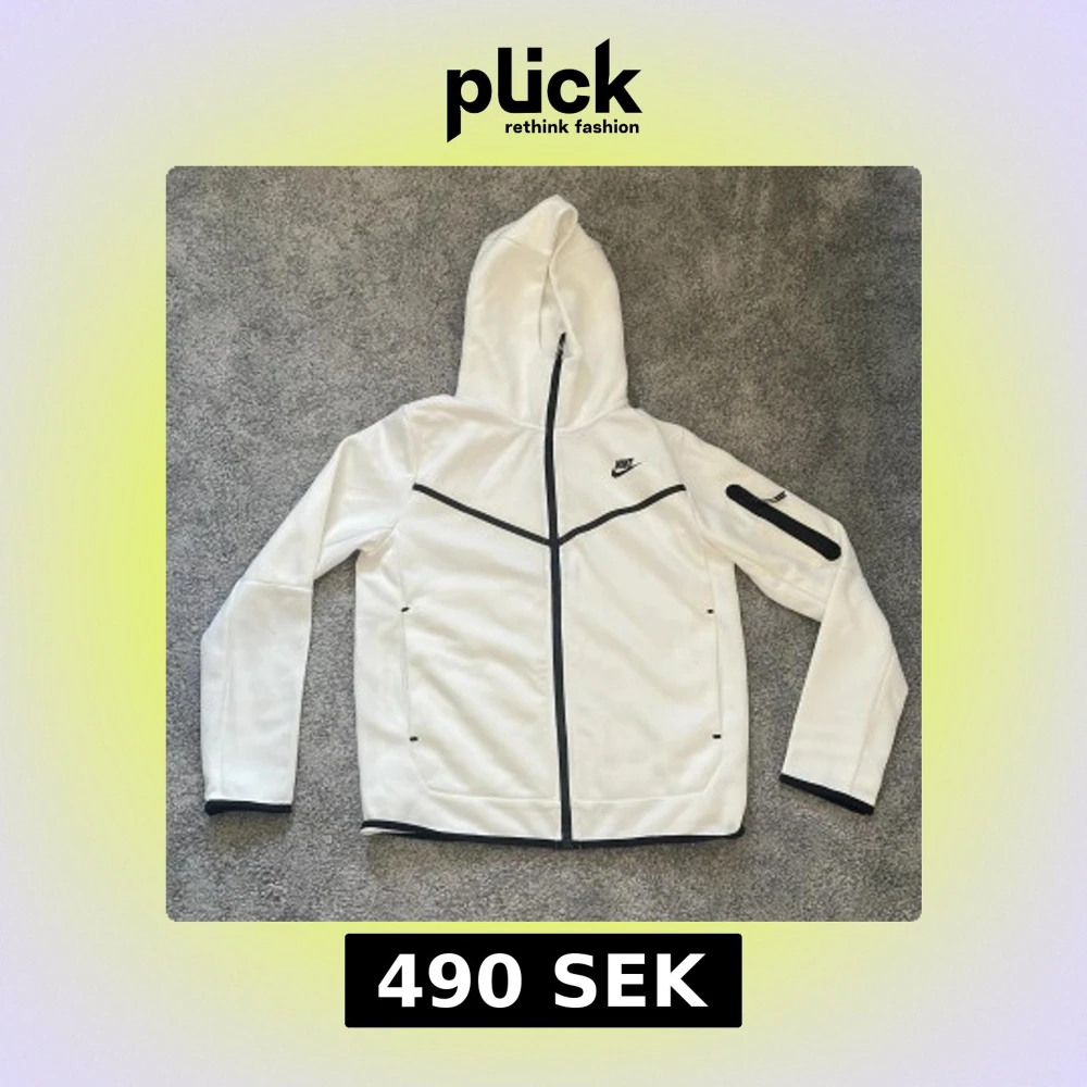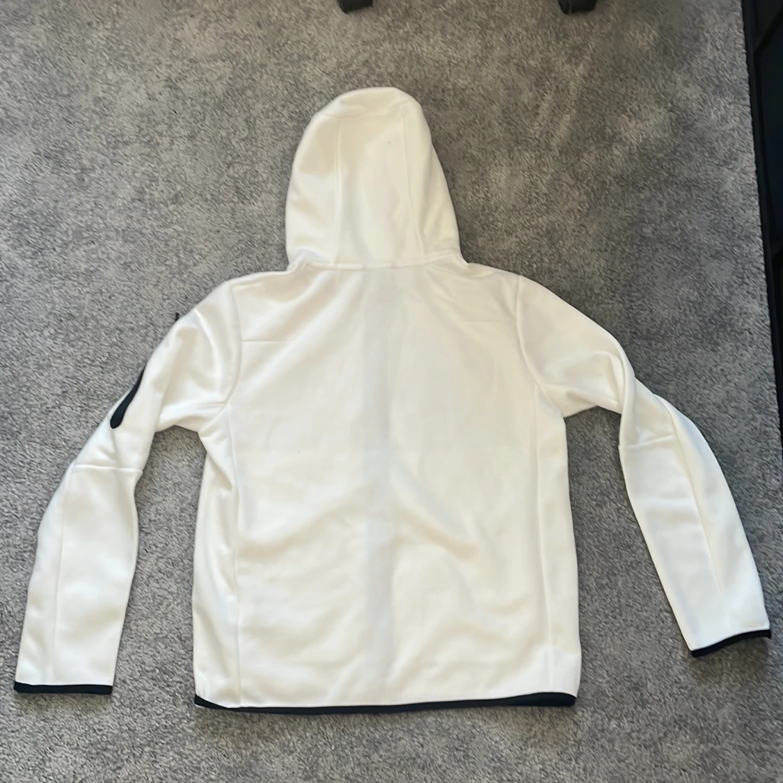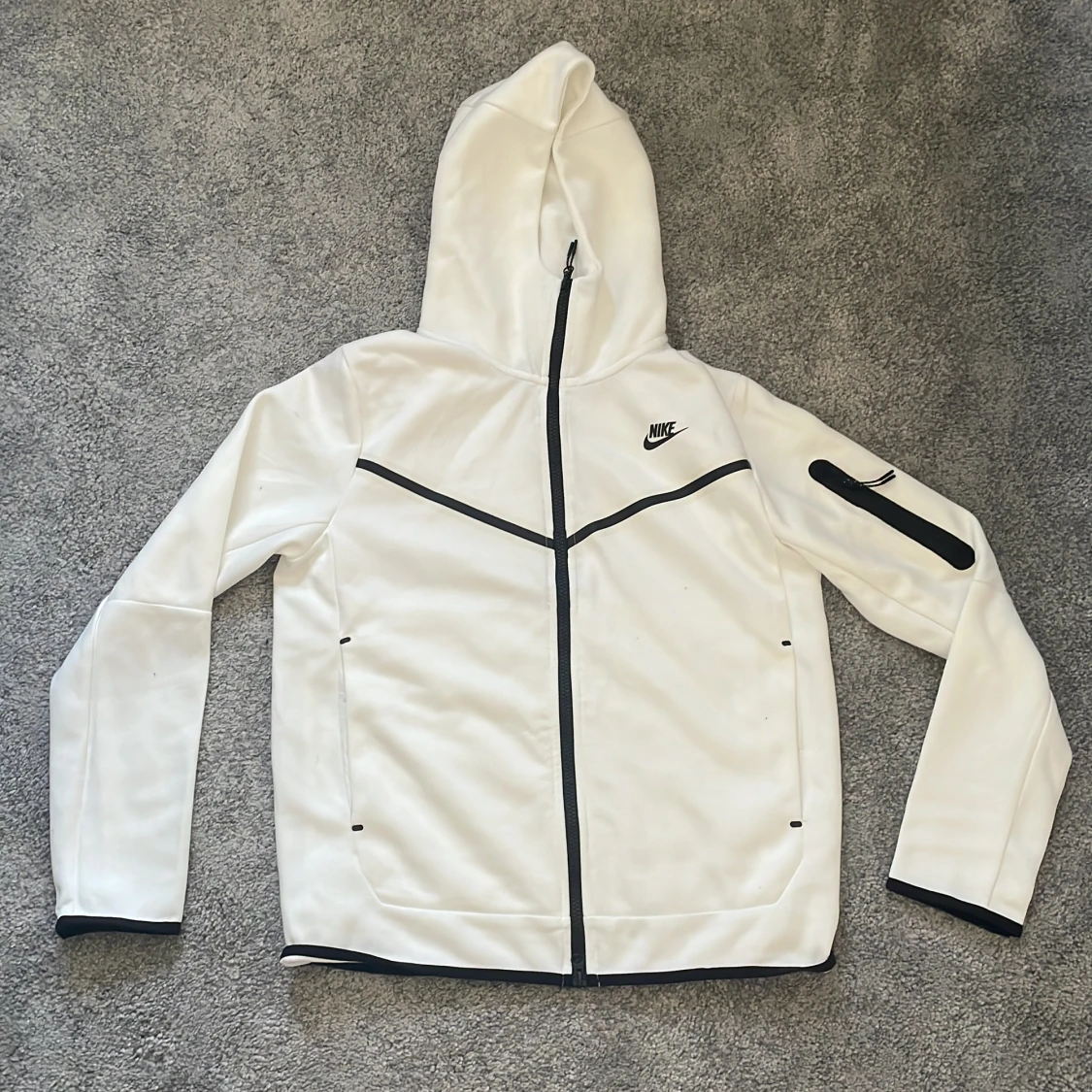 Snygg vit hoodie från Nike med svarta detaljer och dragkedja hela vägen. Hoodien har huva, lång ärm och en cool ficka med dragkedja på ena armen. Perfekt för dig som gillar sportig stil och vill ha något som sticker ut. Jag är 185 cm lång och den passar mig perfekt lite kort bara. Har bara använt den max 5 gånger