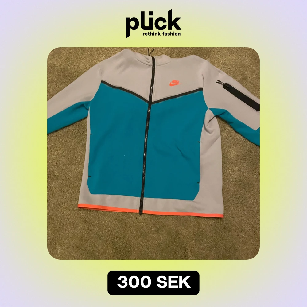Säljer en snygg grå och blå hoodie från Nike. Den har en dragkedja framtill och en cool ficka med dragkedja på ärmen. Perfekt för höst och vår! Jackan har en orange kant nedtill som ger en extra pop av färg. Passar perfekt för träning eller vardagsbruk.