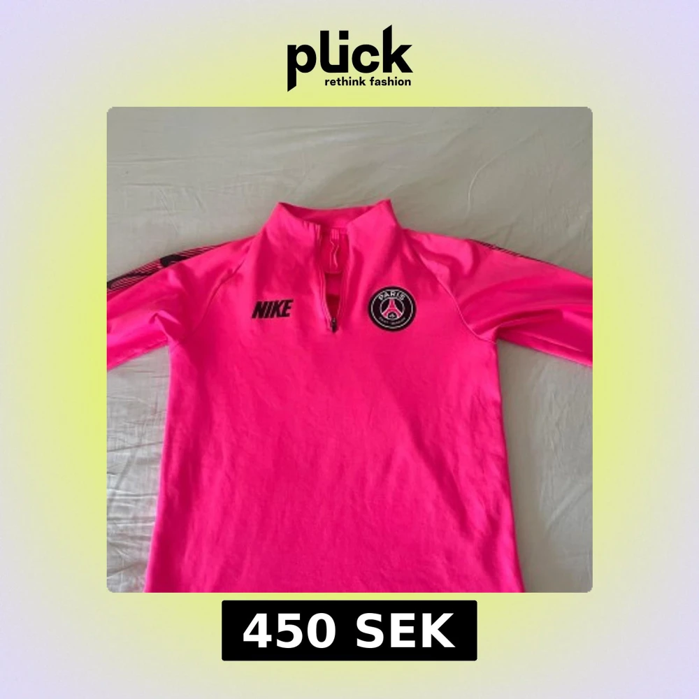 Snygg långärmad fotbollströja från Nike i stark rosa färg med PSG-logga på bröstet och svart Nike-tryck. Tröjan har halv dragkedja framtill och svarta detaljer längs armarna där det står 'PARIS' och Nike-loggor. Perfekt för träning eller när du vill sticka ut.