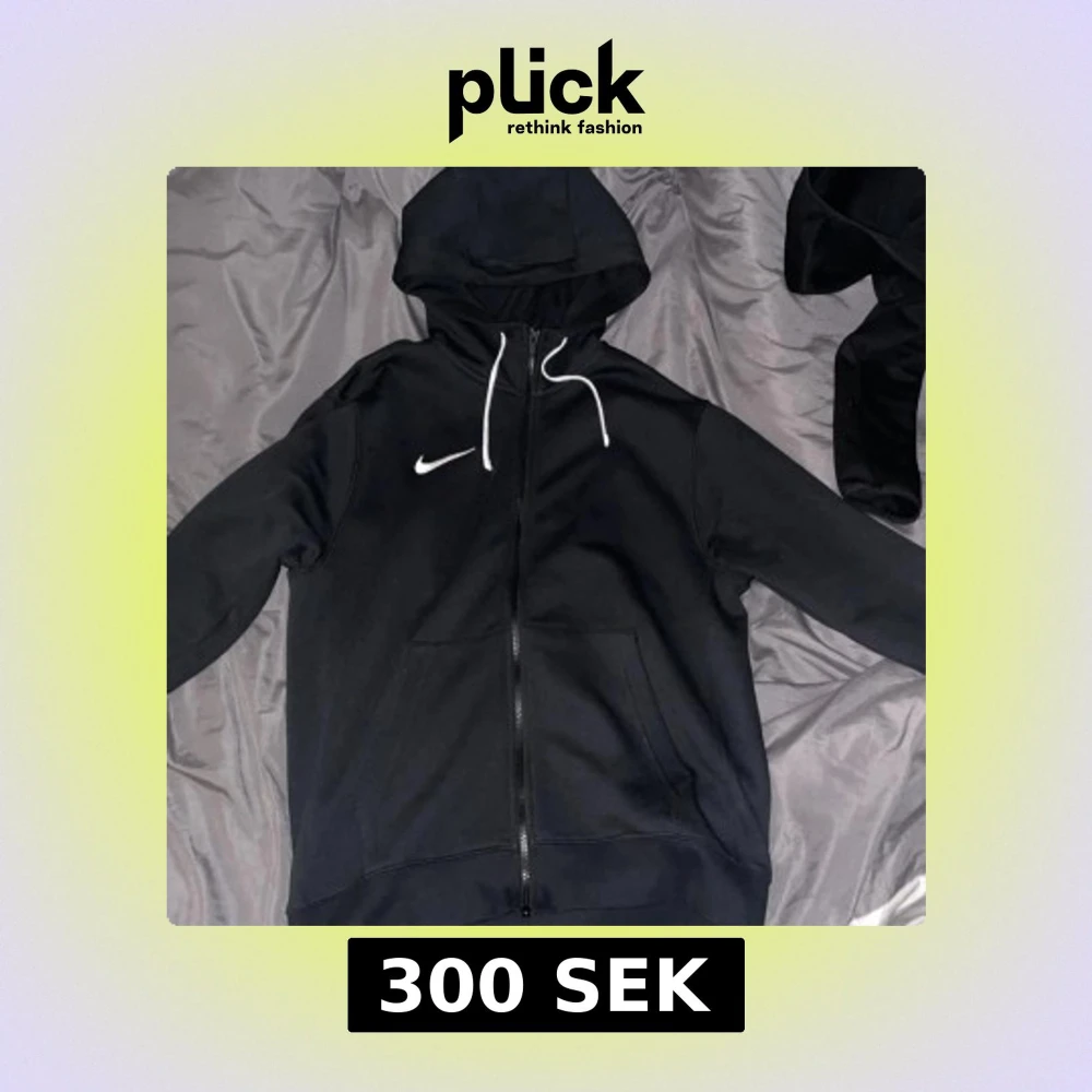 Säljer en svart hoodie från Nike med dragkedja och vit snörning i huvan. Den har en klassisk design med långärmade ärmar och en liten Nike-logga på bröstet. Perfekt för en avslappnad stil.