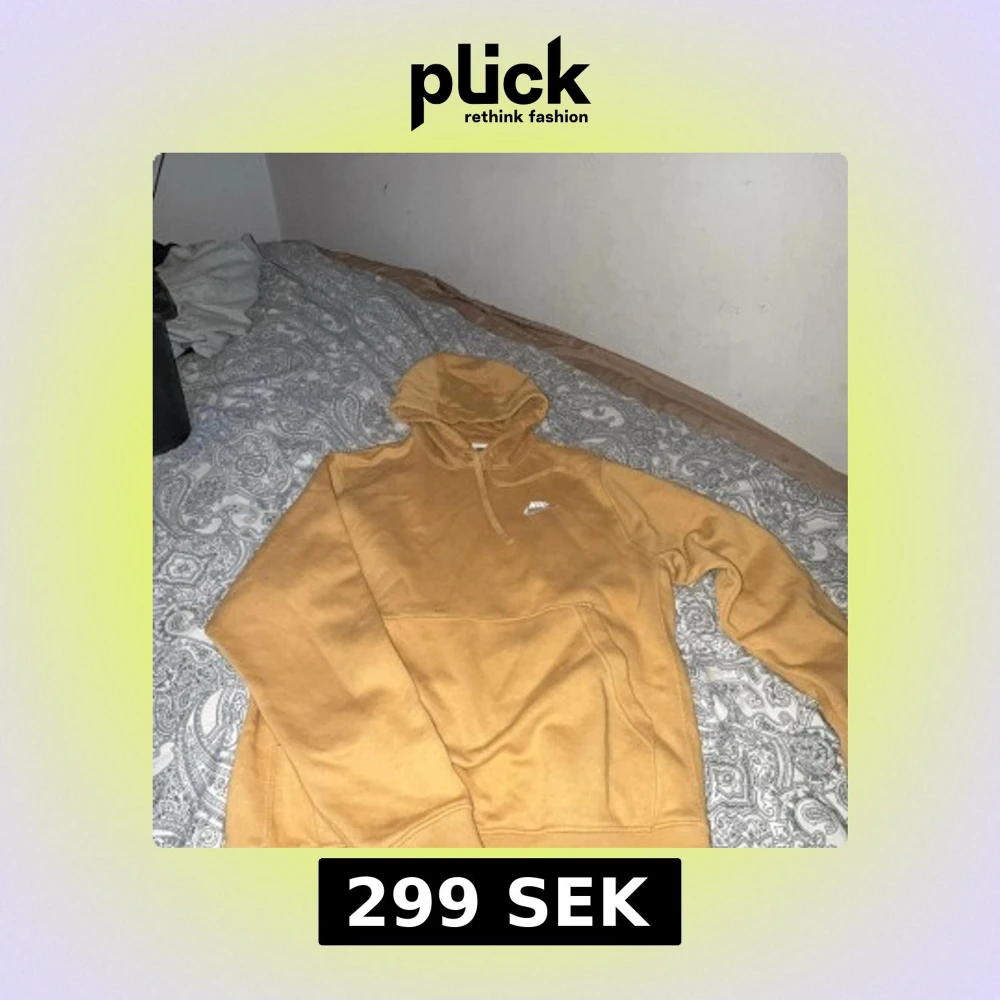 Säljer en snygg mustardgul hoodie från Nike med klassisk logga på bröstet. Tröjan har huva med snörning och en stor magficka. Perfekt för dig som gillar streetwear och vill ha en bekväm och stilren look.