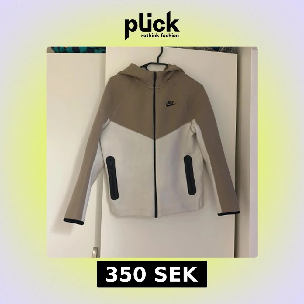 Säljer en snygg beige och vit jacka från Nike med dragkedja framtill. Jackan har långa ärmar och en huva, samt svarta detaljer vid fickorna. Perfekt för en sportig look!