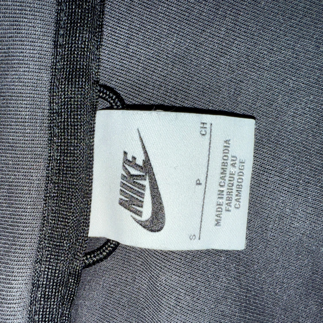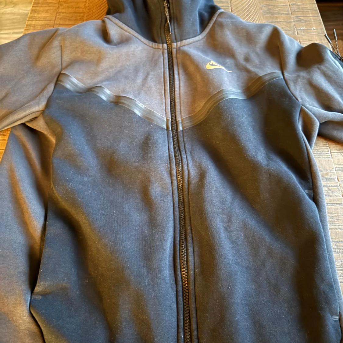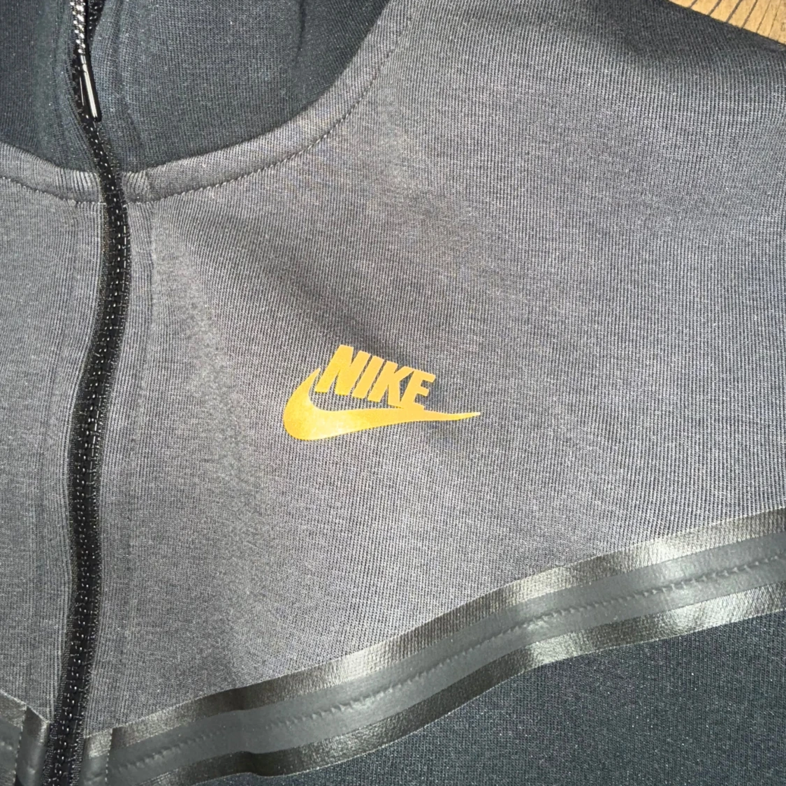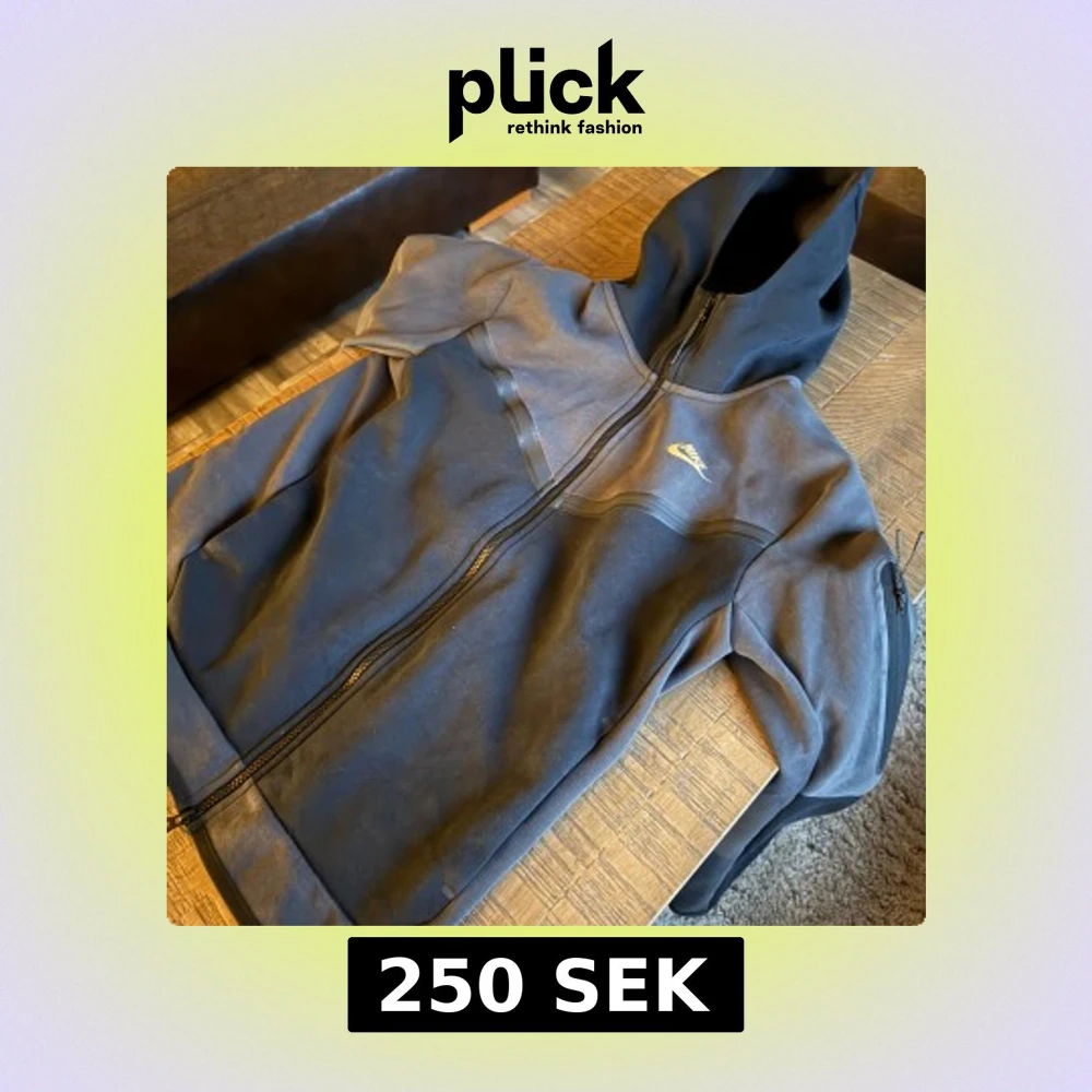 Säljer en svart och grå hoodie från Nike med dragkedja och huva. Den har en guldig Nike-logga på bröstet och är tillverkad i ett mjukt material. Perfekt för en casual look eller träning.