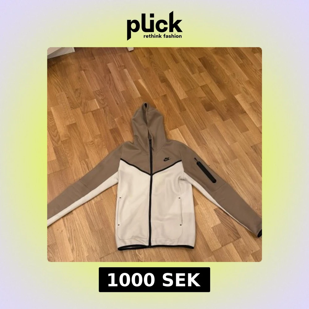 Nike hoodie i beige och vitt med svart logga på bröstet. Tröjan har hel dragkedja framtill, huva och en praktisk ficka med dragkedja på ena ärmen. Materialet är mjukt och känns som polyester. Snygg kontrast med svarta detaljer och sportig look.