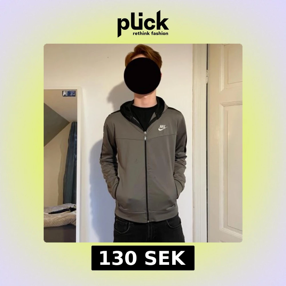 Säljer en grå/grön hoodie från Nike med dragkedja och vit loga på bröstet. Hoodien har svarta detaljer längs ärmarna. Perfekt för en sportig look! Det finns fläckar på hoodien syns på bilderna avgör själv.