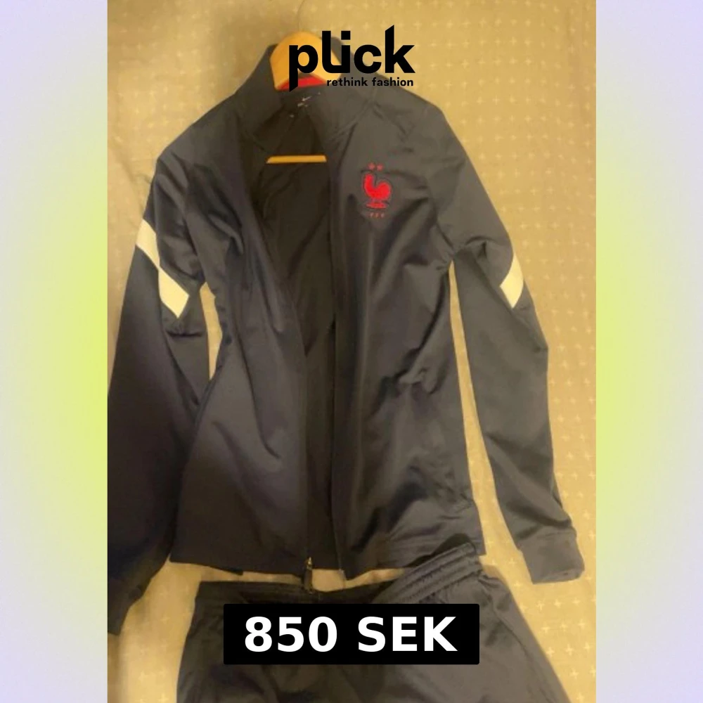 Snyggt träningsset från Nike med FFF-logga, består av en marinblå zip-jacka och matchande byxor. Setet har vita detaljer på ärmar och ben samt röda broderade loggor. Materialet är lätt och syntetiskt, perfekt för sport och aktivitet.