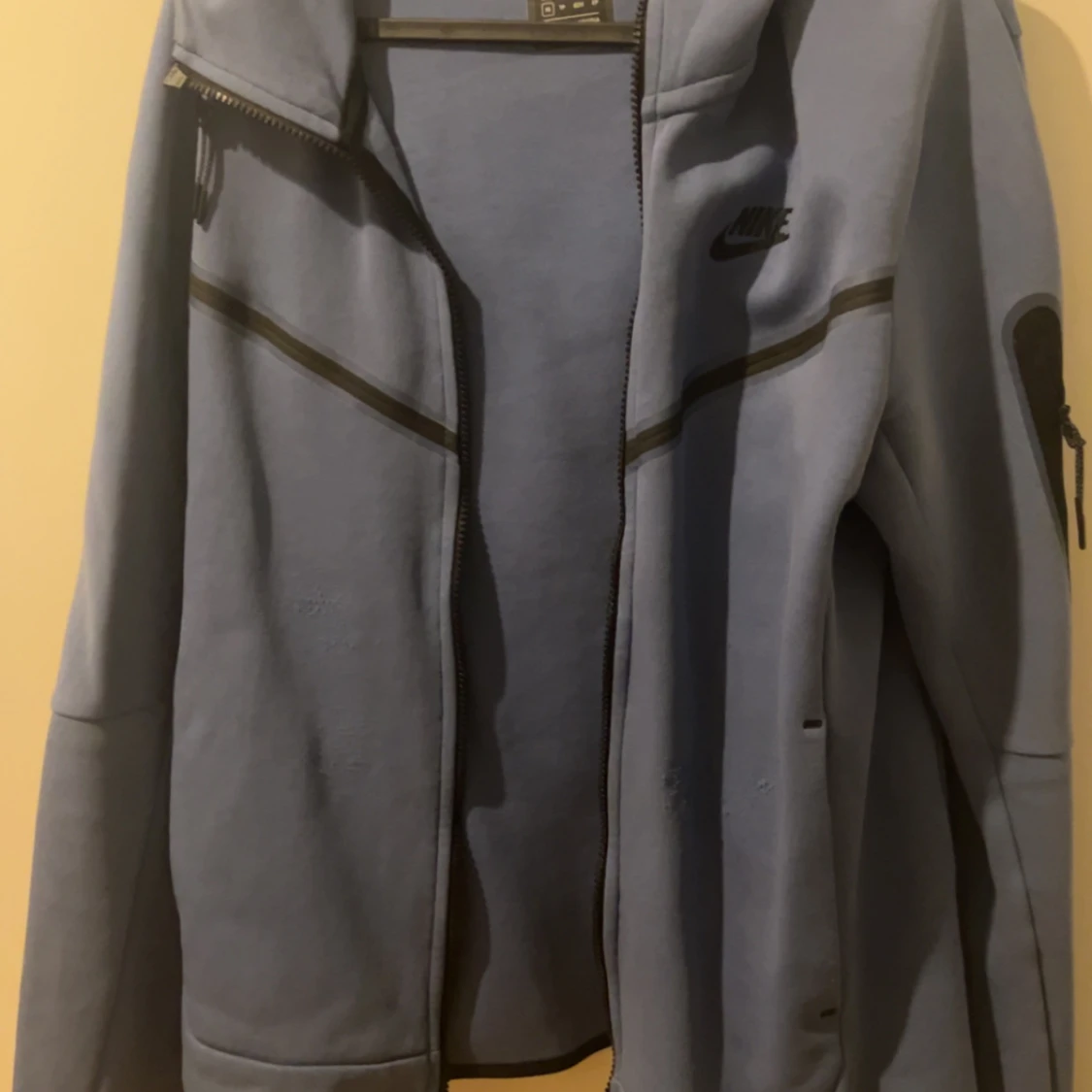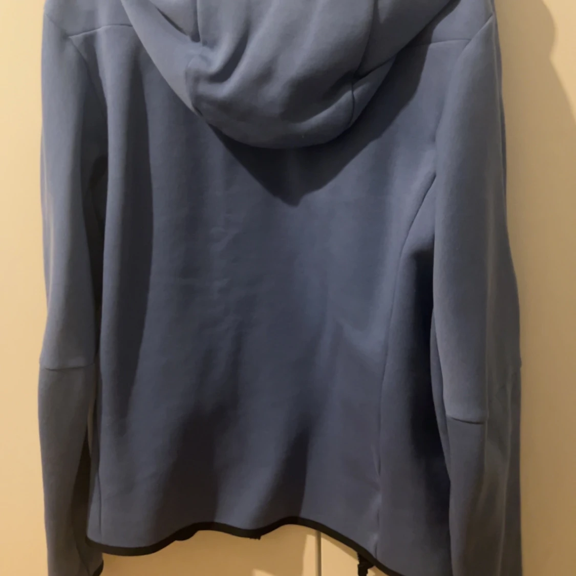 Säljer en snygg blå hoodie från Nike med dragkedja och huva. Den har svarta detaljer och en ficka på ärmen. Perfekt för en avslappnad stil.