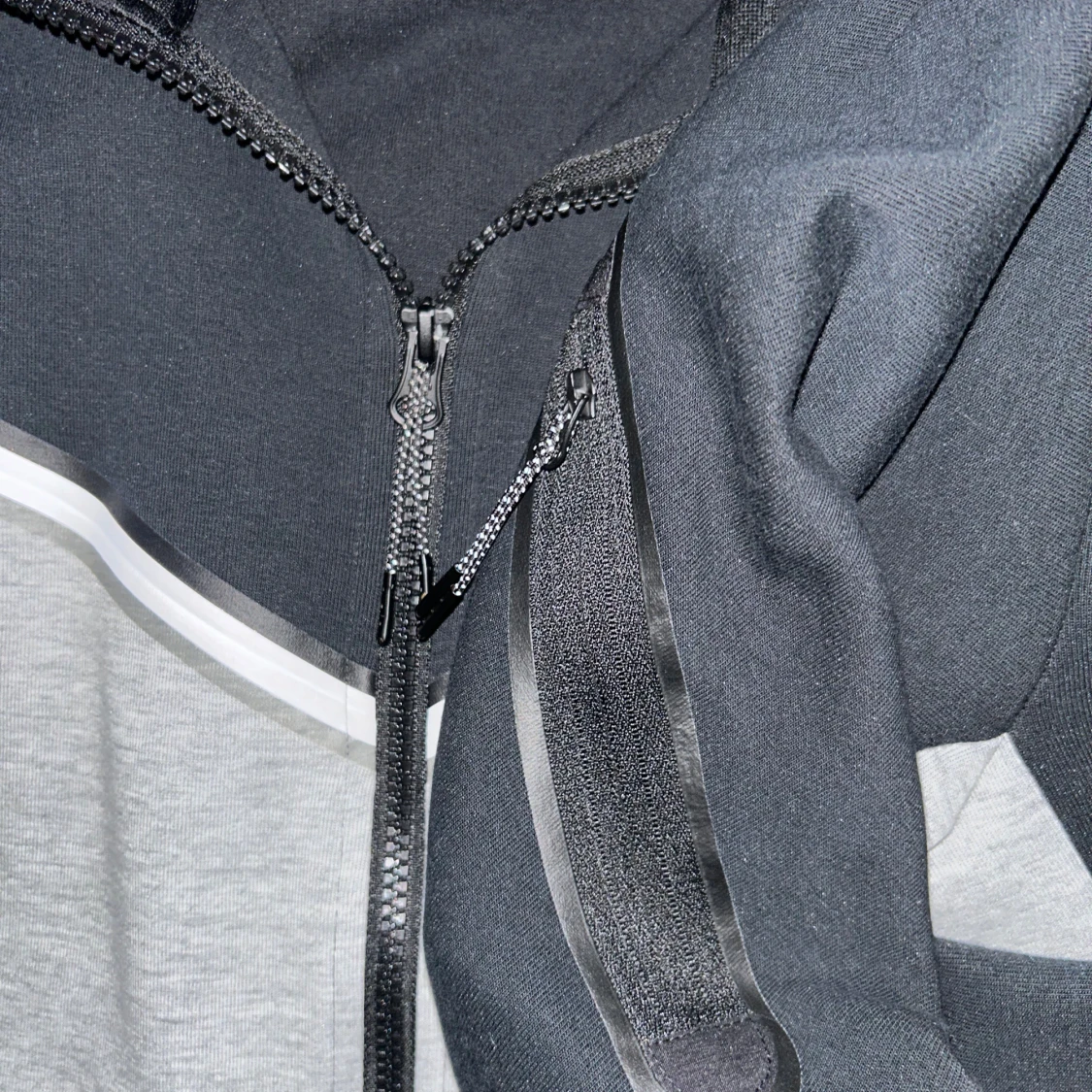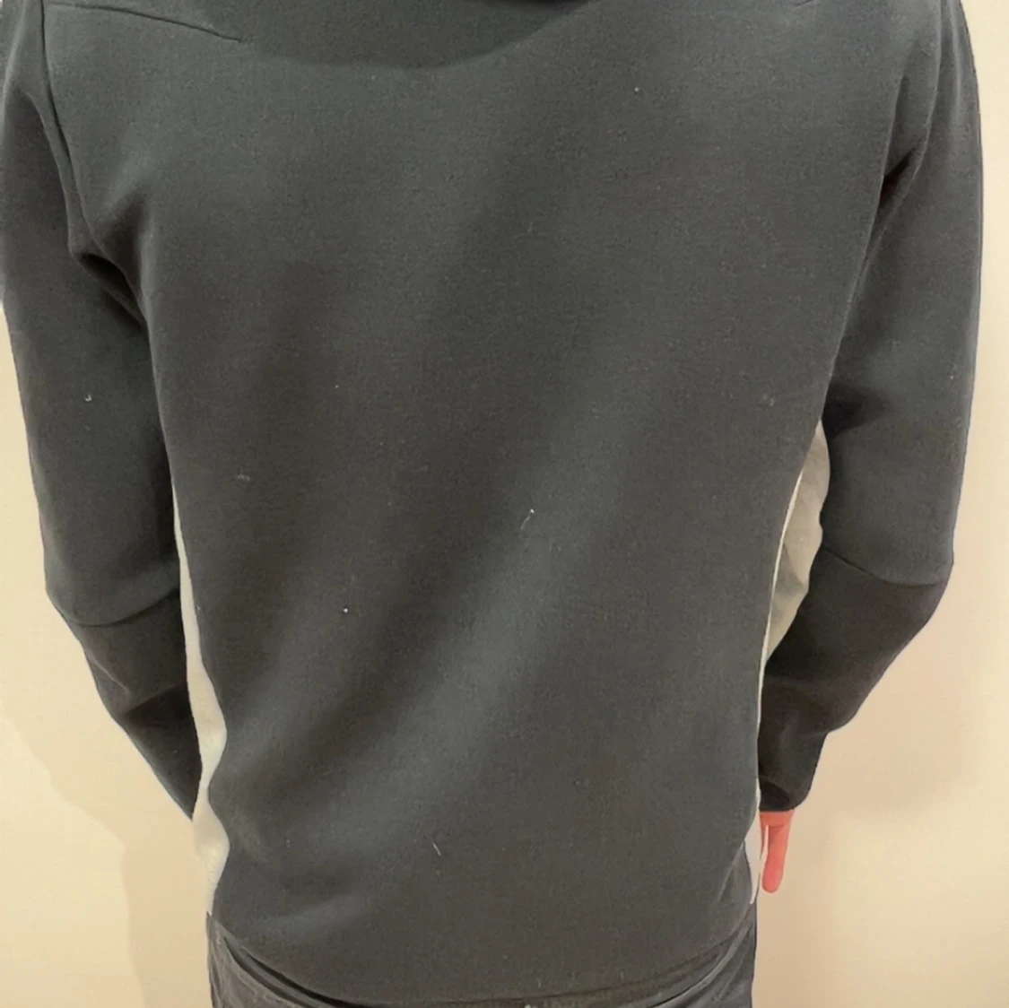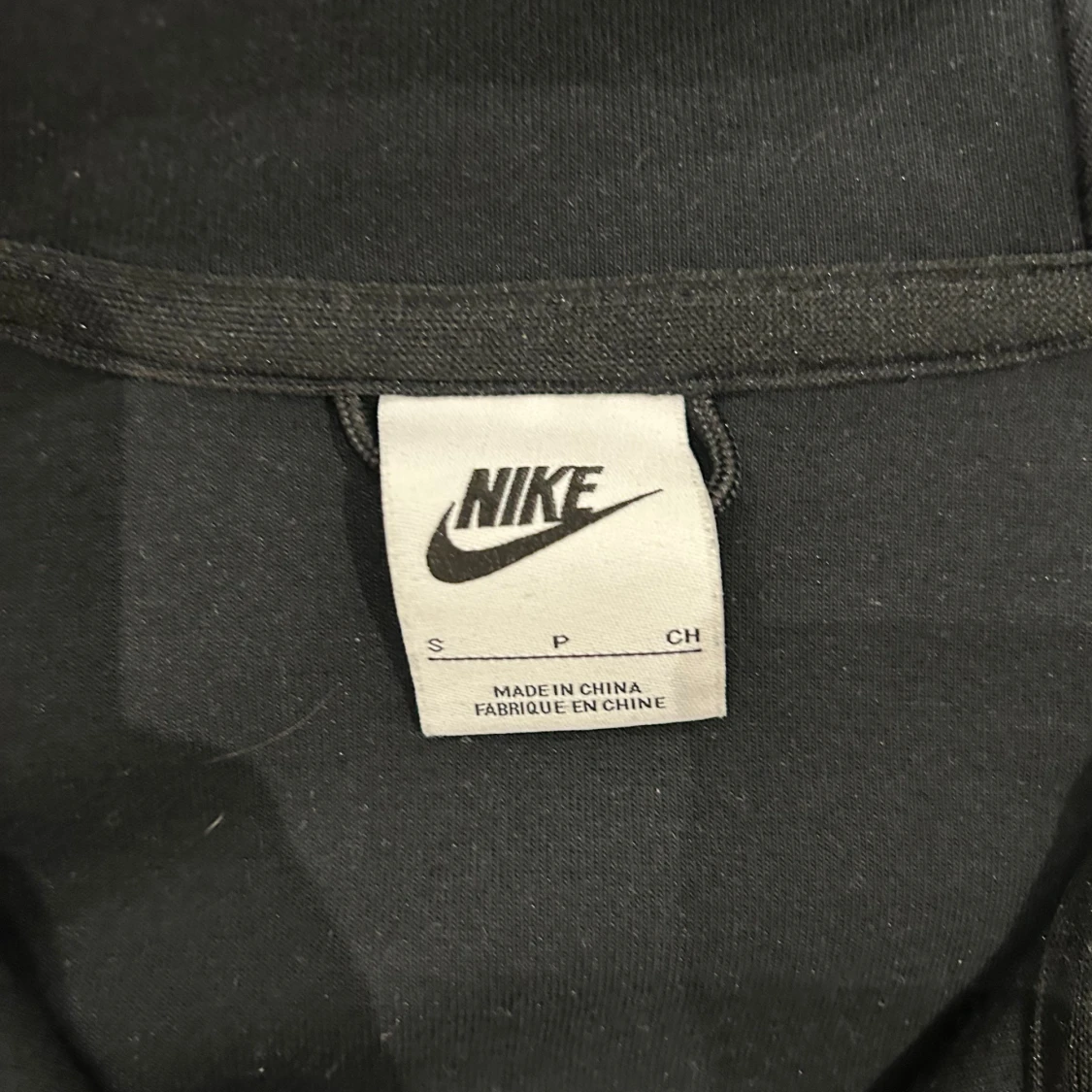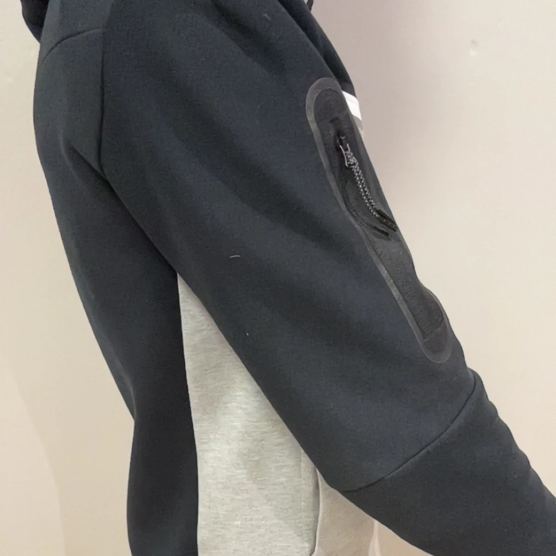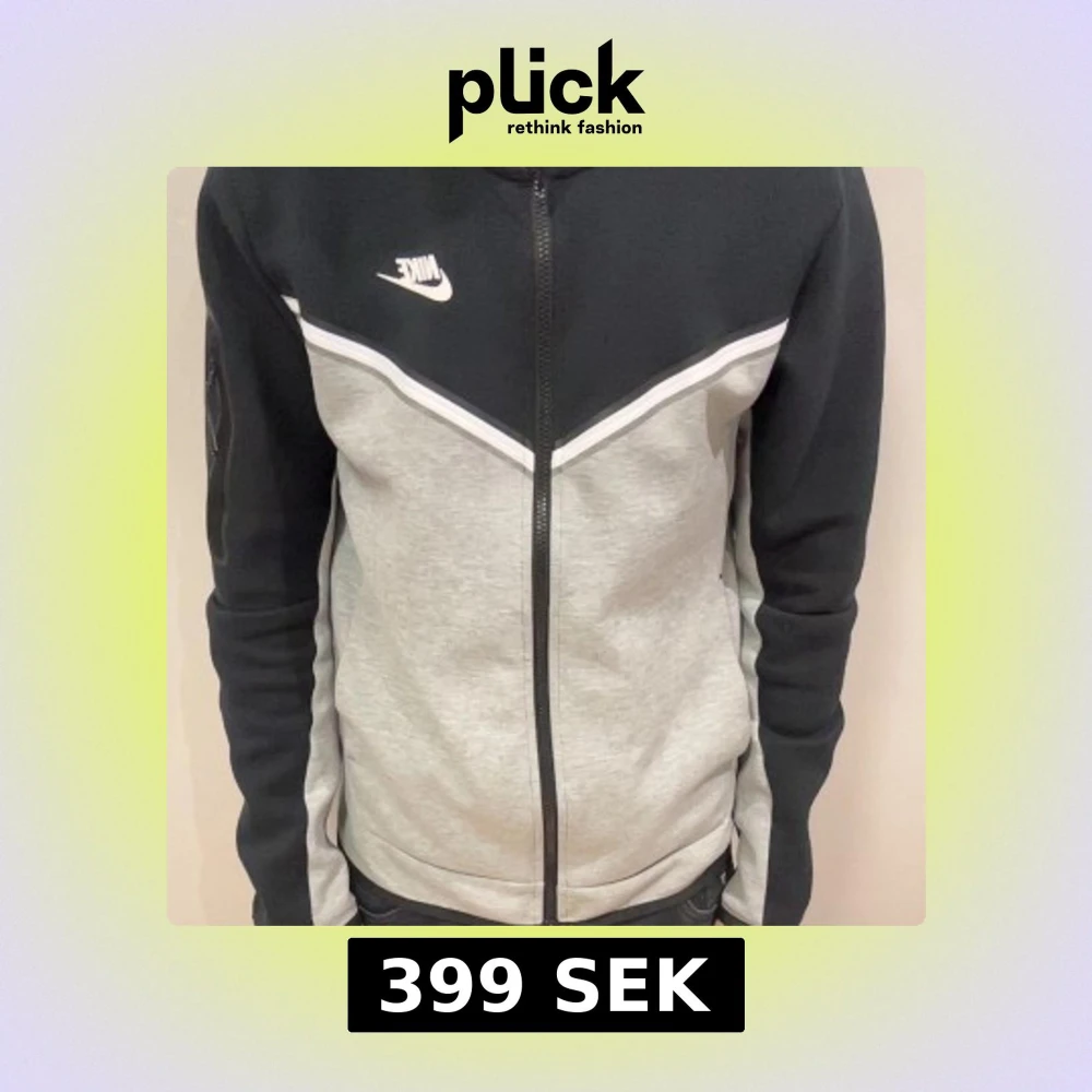 Nike tech fleece i svart och ljusgrått med vit logga på bröstet. Koftan har hel dragkedja framtill, långärmade ärmar och en snygg detalj med dragkedjeficka på ena ärmen. Materialet är mjukt och känns sportigt, perfekt för chill eller träning. Pris ej hugget i sten så det är bara att höra av sig.🤩