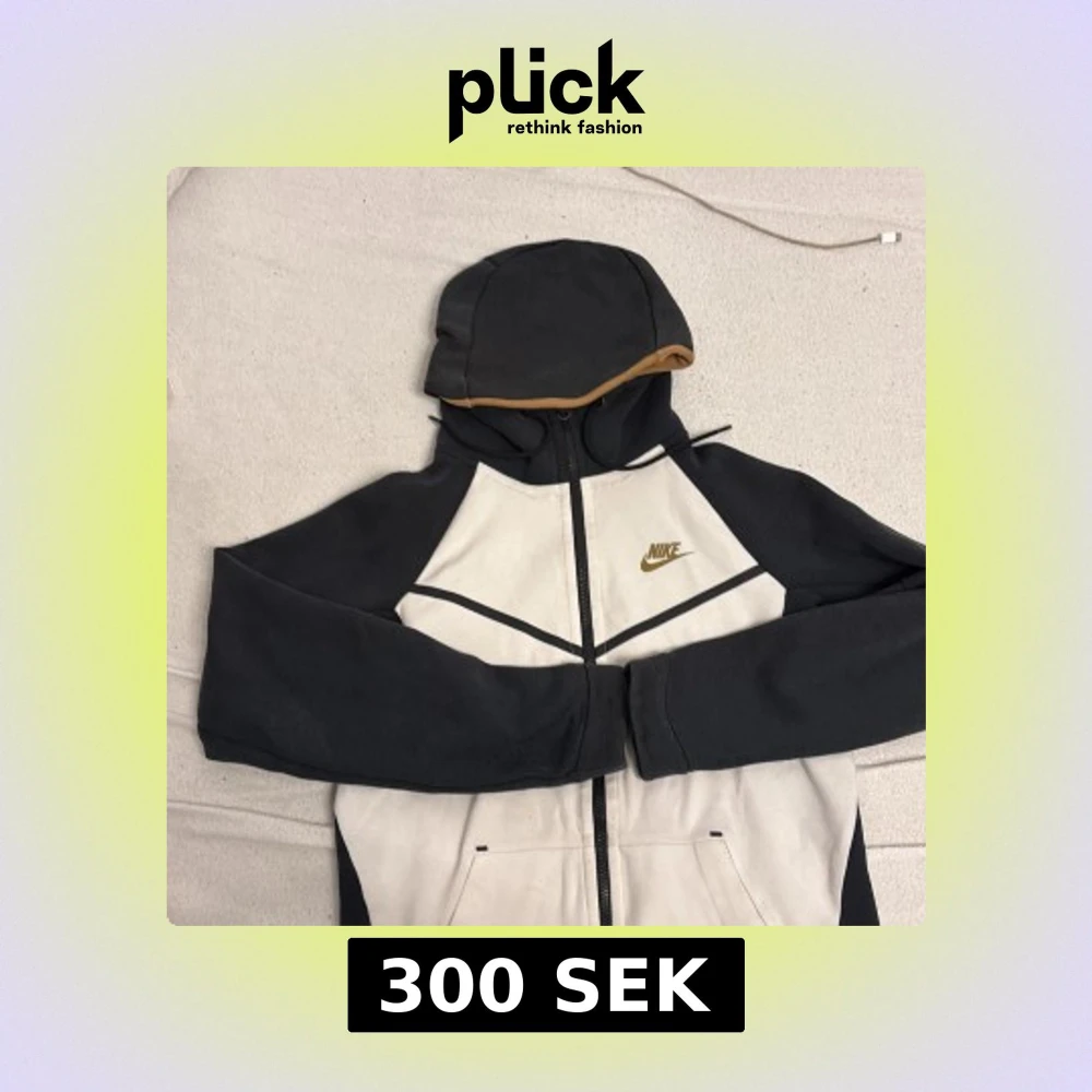 Nike hoodiejacka i svart och vit med guldigt logotryck på bröstet. Jackan har hel dragkedja, huva med snörning och två fickor fram. Insidan av huvan är beige. Perfekt för dig som gillar sportig och clean stil.