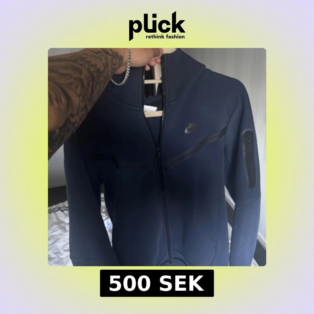 Säljer en mörkblå hoodie från Nike med hel dragkedja och huva. Tröjan har svarta detaljer, en ficka med dragkedja på ärmen och Nike-logga på bröstet. Perfekt för chill eller träning, riktigt snygg och skön passform.