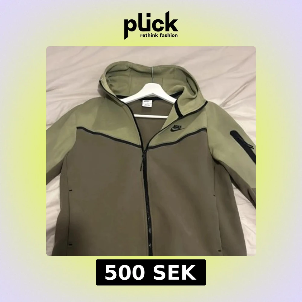 Nike Tech hoodie i två gröna nyanser med svart logga på bröstet. Tröjan har huva, hel dragkedja framtill och en ficka med dragkedja på ärmen. Snyggt sportig look med svarta detaljer och stilren design. Perfekt för dig som gillar streetwear. Har även byxorna till i storlek M 300kr extra