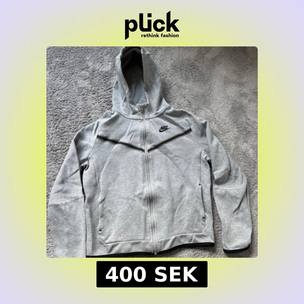Säljer en grå Nike Tech Fleece hoodie med dragkedja och huva.