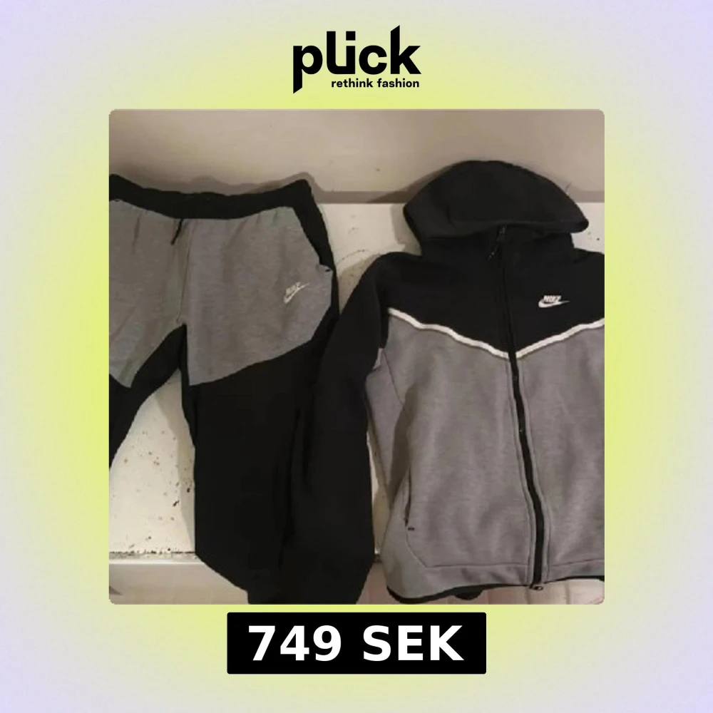 En Nike tech tracksuit i färgen grå/svart . Hoodien är i storlek S och är i bra condition , byxorna är i storlek M och är lite noopriga i fickorna men annars bra condition. Bara att skriva för frågor eller om bilder👍