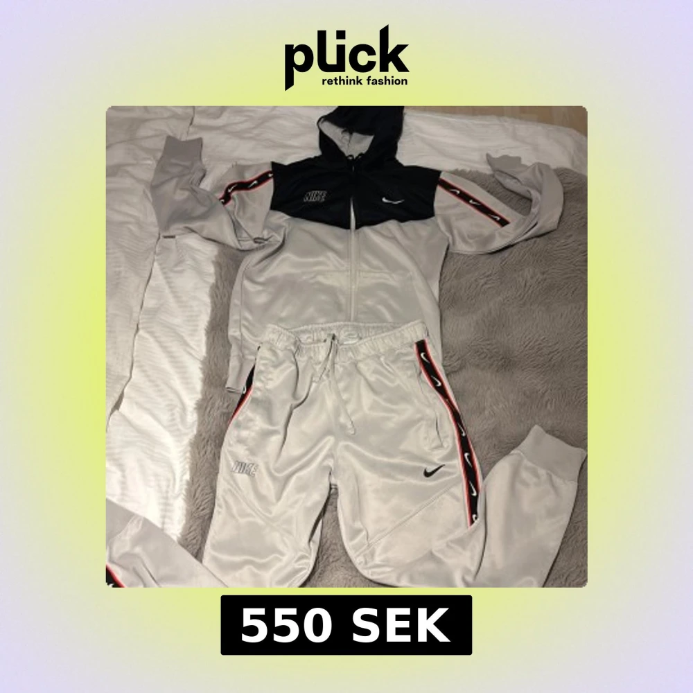 Nike tracksuit i ljusgrått med svarta och röda logoband längs sidorna. Byxorna har snörning i midjan, muddar vid bensluten och två fickor. Hoddien är svart vid bröstet och med röd logo band med och resten ljusgrå. Materialet är mjukt och glansigt, perfekt för chill eller sport. Swoosh-logga på benet och Nike-brodyr vid fickan