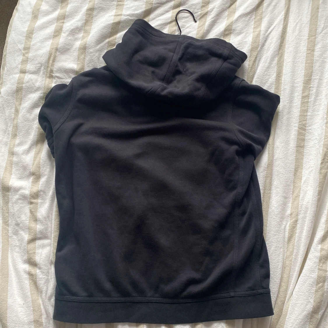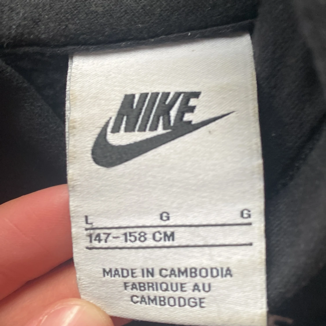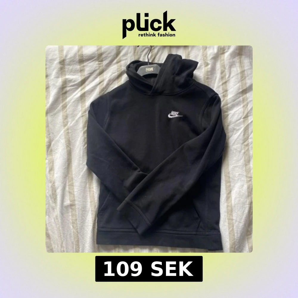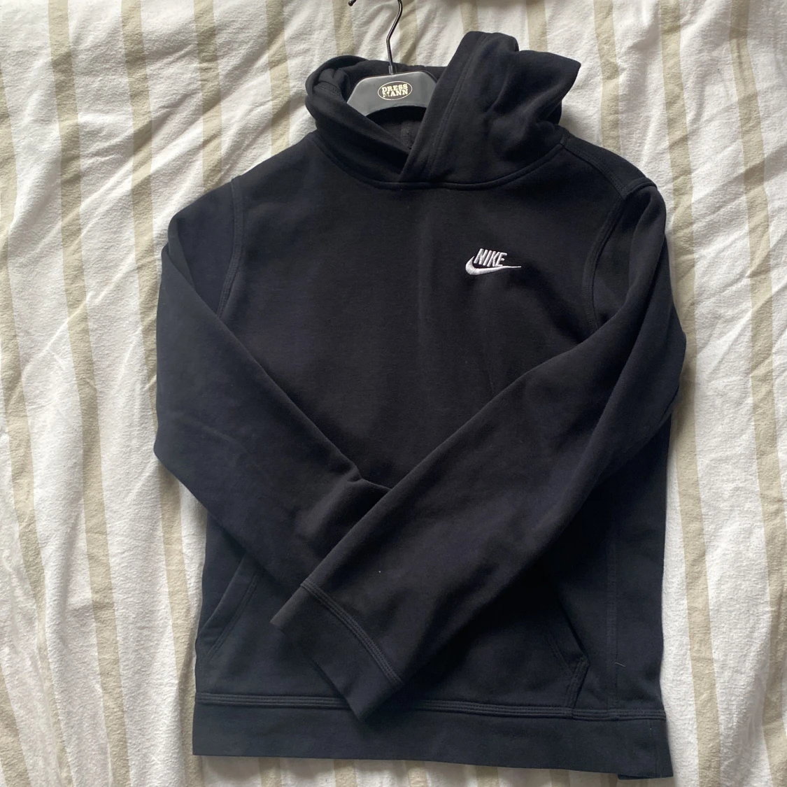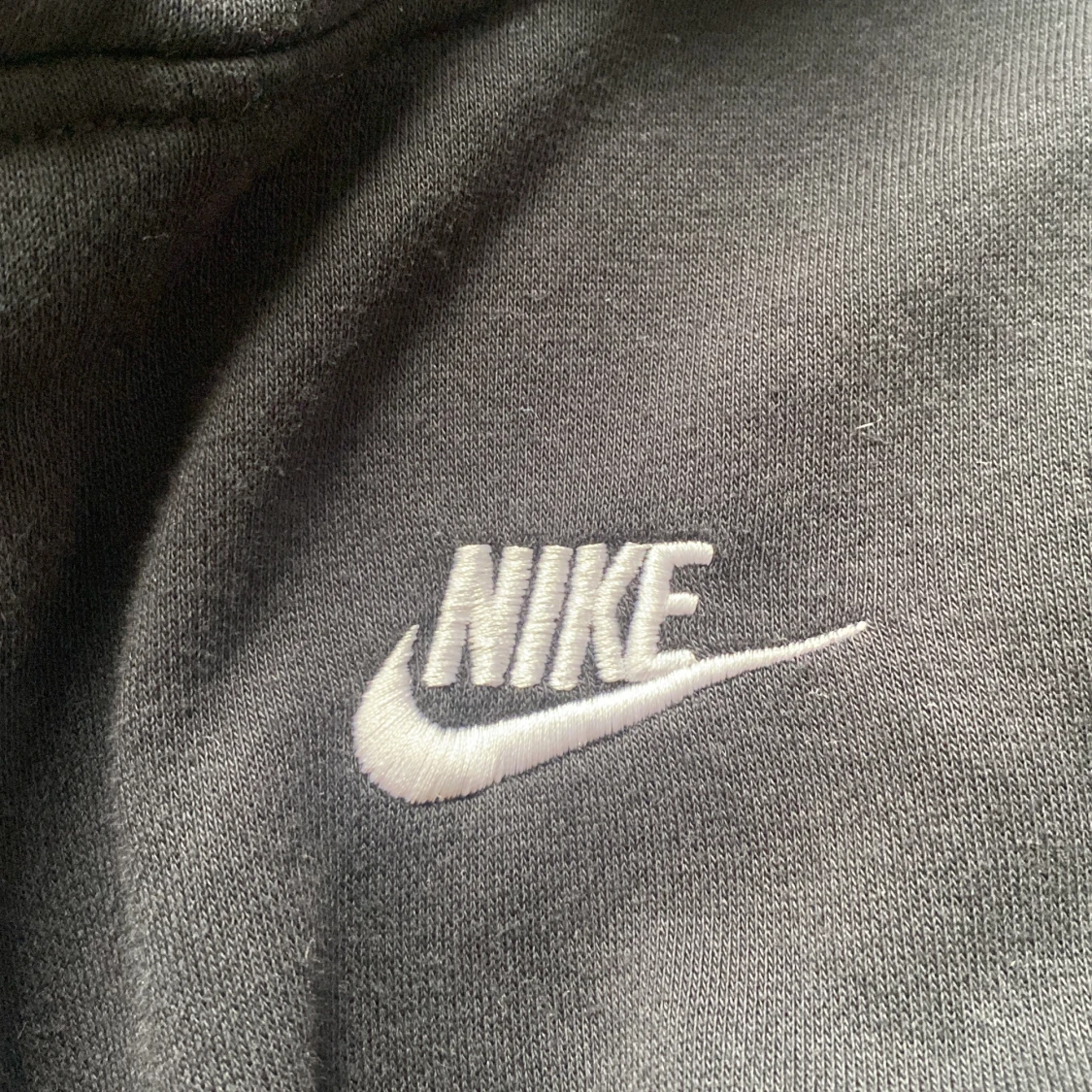 Säljer en svart hoodie från Nike med broderad vit logga på bröstet. Tröjan har långa ärmar, huva och är tillverkad i mjukt material. Perfekt för en sportig och avslappnad stil.