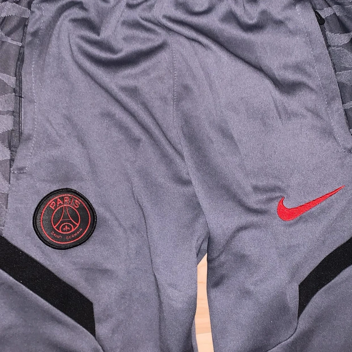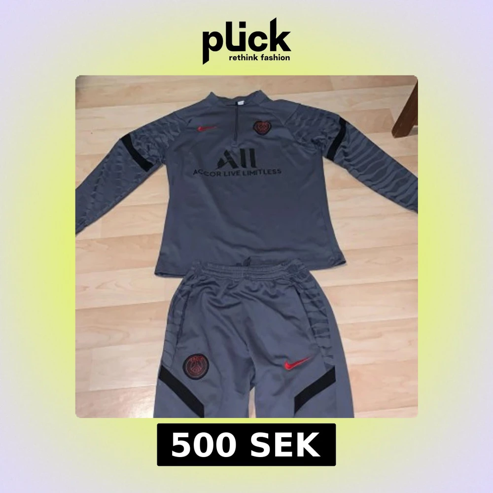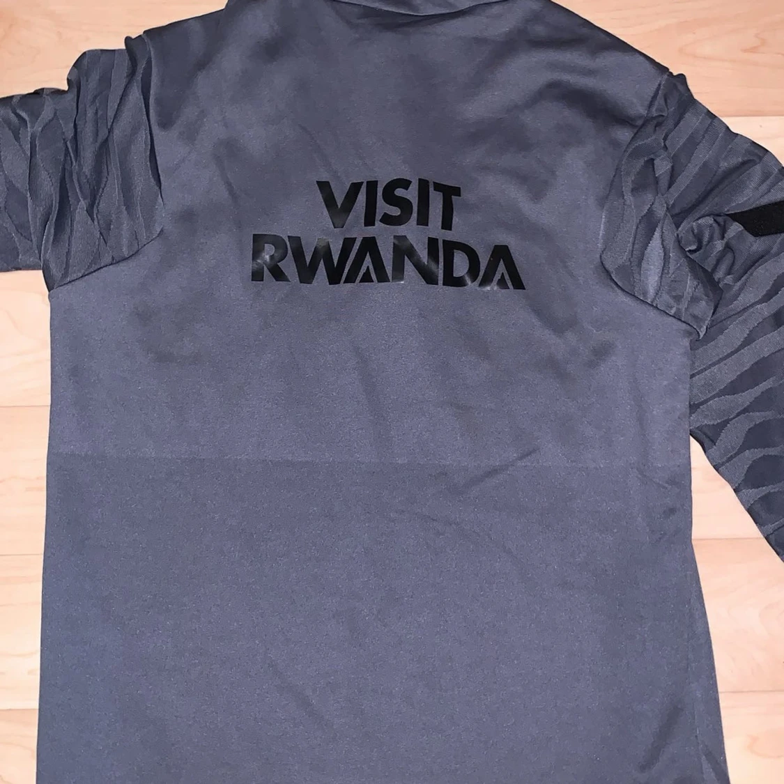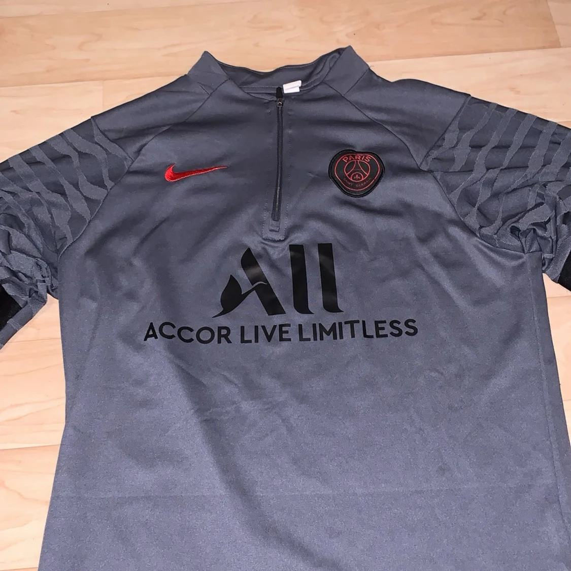 Säljer ett grått långärmat träningsset från PSG med svarta och röda detaljer. Tröjan har halv dragkedja, PSG-logga och Accor Live Limitless-tryck framtill samt Visit Rwanda på ryggen. Ärmarna har subtilt zebramönster. Materialet är lätt och andas, perfekt för träning.