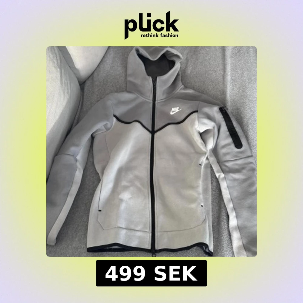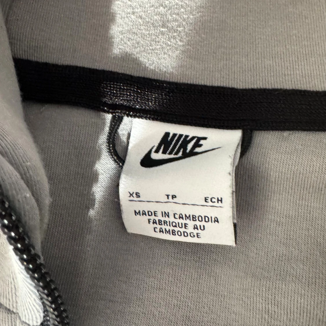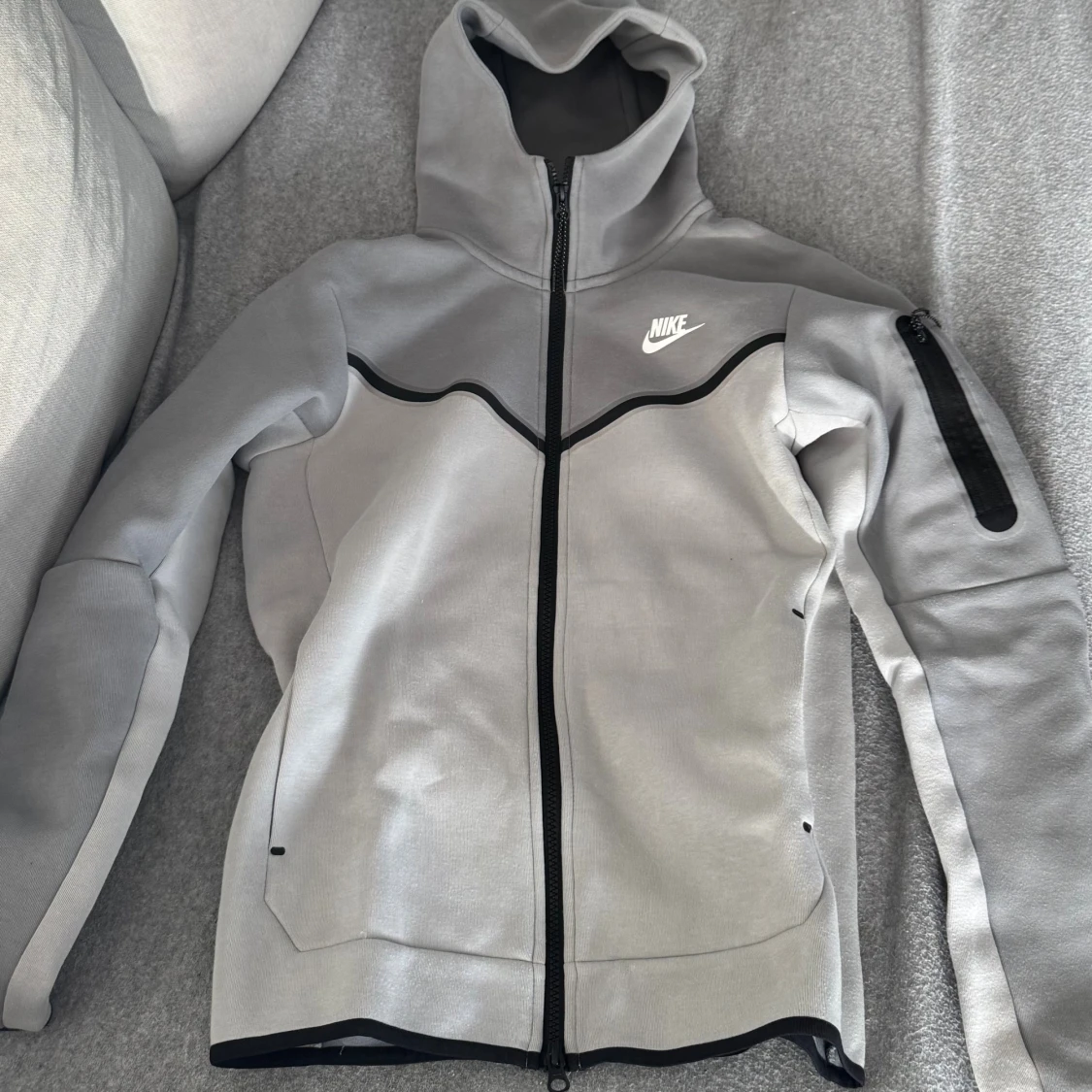 Säljer en grå Nike tech från Nike i storlek XS. Jackan har hel dragkedja, huva och en svart detalj längs bröstet. Ficka med dragkedja på ena ärmen och diskret Nike-logga på bröstet. Perfekt för dig som gillar sportig och clean stil.