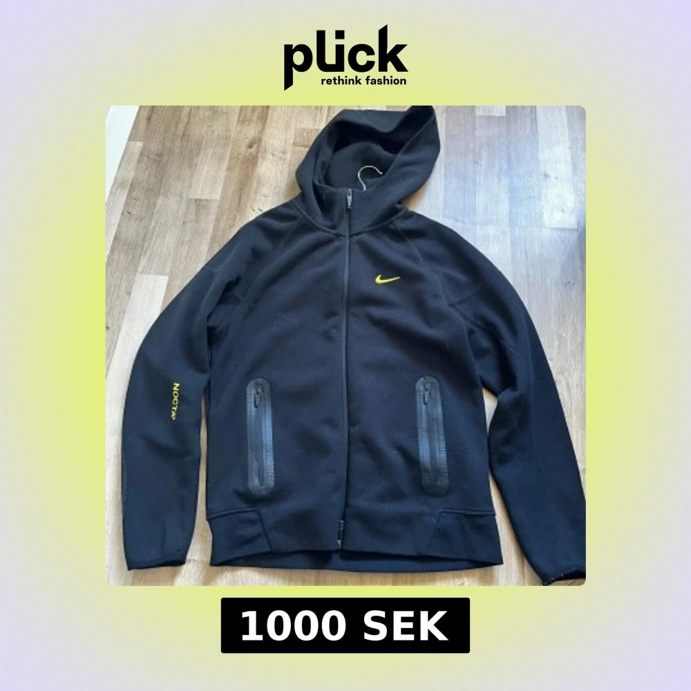 Säljer en stilren svart jacka från Nike NOCTA med dragkedja och huva. Jackan har gula detaljer och två praktiska fickor med dragkedjor framtill. Perfekt för en sportig look.