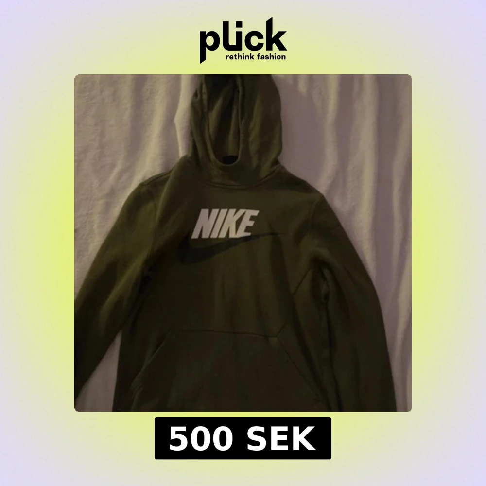 Säljer en olivgrön hoodie från Nike med stor vit logga på bröstet. Tröjan har en klassisk design med huva och en stor magficka framtill. Perfekt för en avslappnad stil.