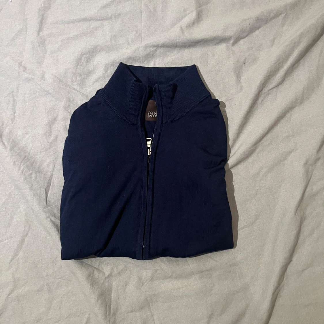 Mörkblå zip från Oscar Jacobson i storlek S som är mjuk, bekväm och sitter riktigt snyggt. Perfekt till både vardag, skola och chill!