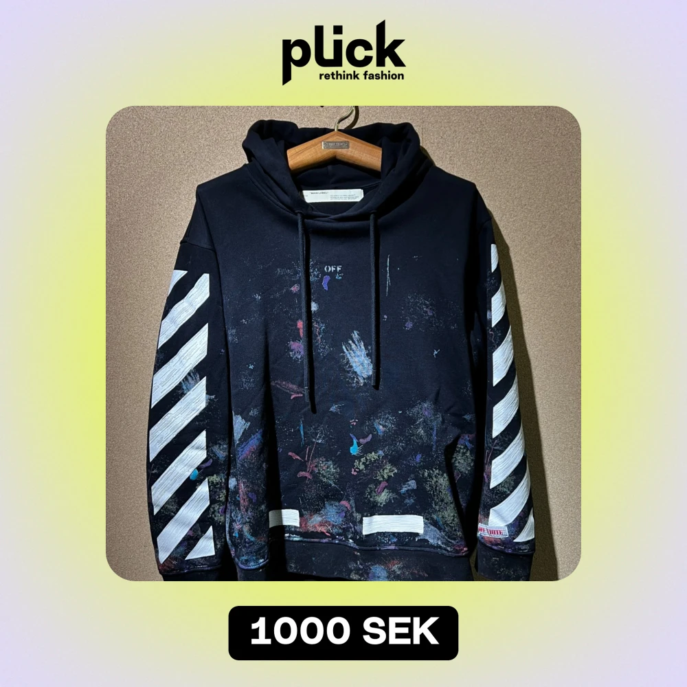 Ej äkta OW men bra kvalité svart hoodie och matchande byxor från OW. L/XL normal fit. Hoodien har vita diagonala ränder på ärmarna och ett stort tryck på ryggen. Båda plaggen har färgstänk för en unik look. Perfekt för streetwear-stilen!