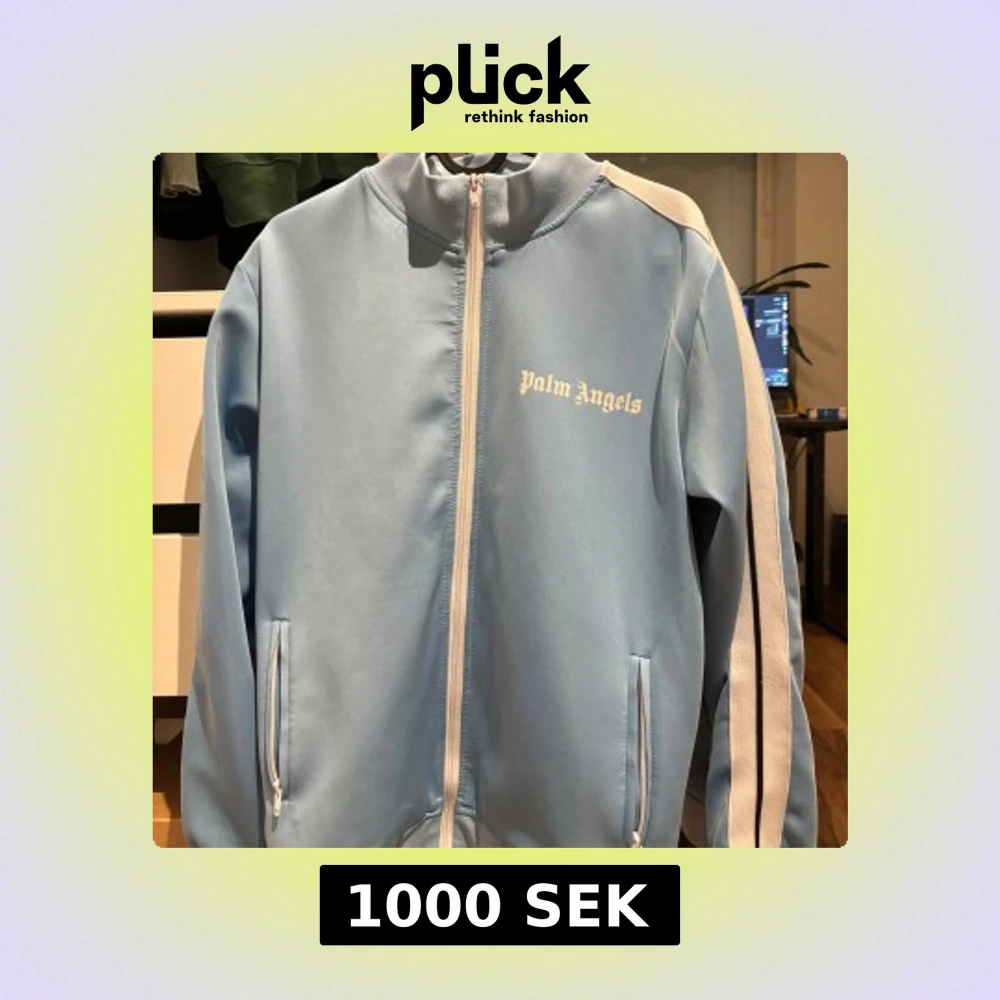 Säljer en ljusblå vindjacka från Palm Angels med vita och svarta ränder längs ärmarna. Jackan har hel dragkedja framtill, ståkrage och två fickor med dragkedja. Materialet är mjukt och syntetiskt, perfekt för en chill streetwear-look.