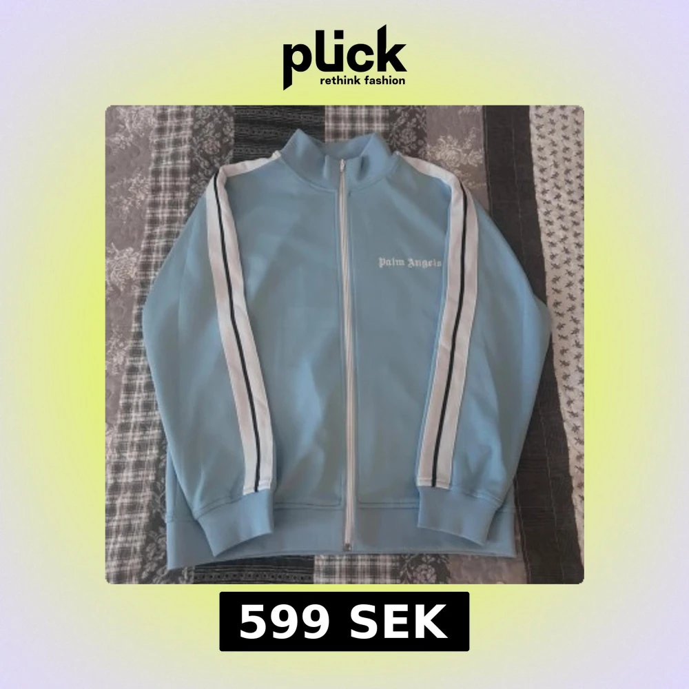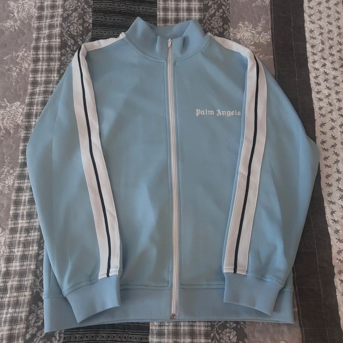Säljer en snygg ljusblå track jacket från Palm Angels med vita och svarta ränder längs ärmarna. Jackan har en dragkedja framtill och en hög krage. Perfekt för en sportig look!